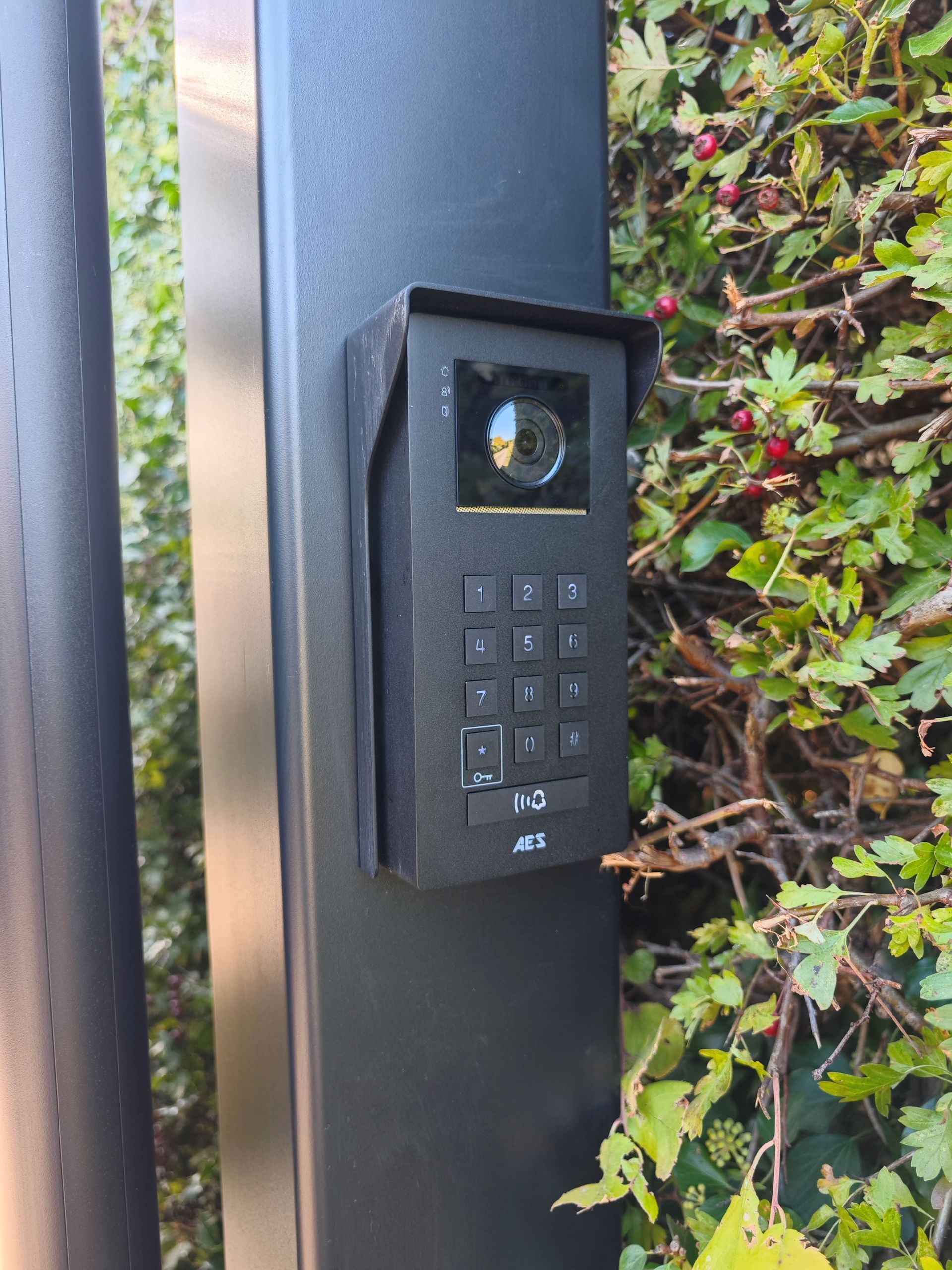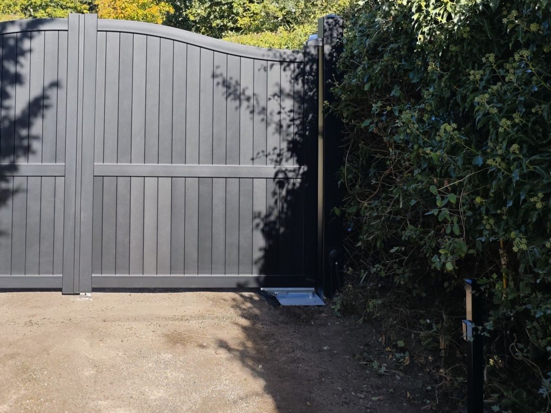 Maintenance free aluminium gates mounted to matching post's. Attached to Nice underground gate motors and operated by remote control key fobs. Also installed is the AES Opyn intercom which has a video and audio function allowing remote operation of the gates when visitors arrive.
