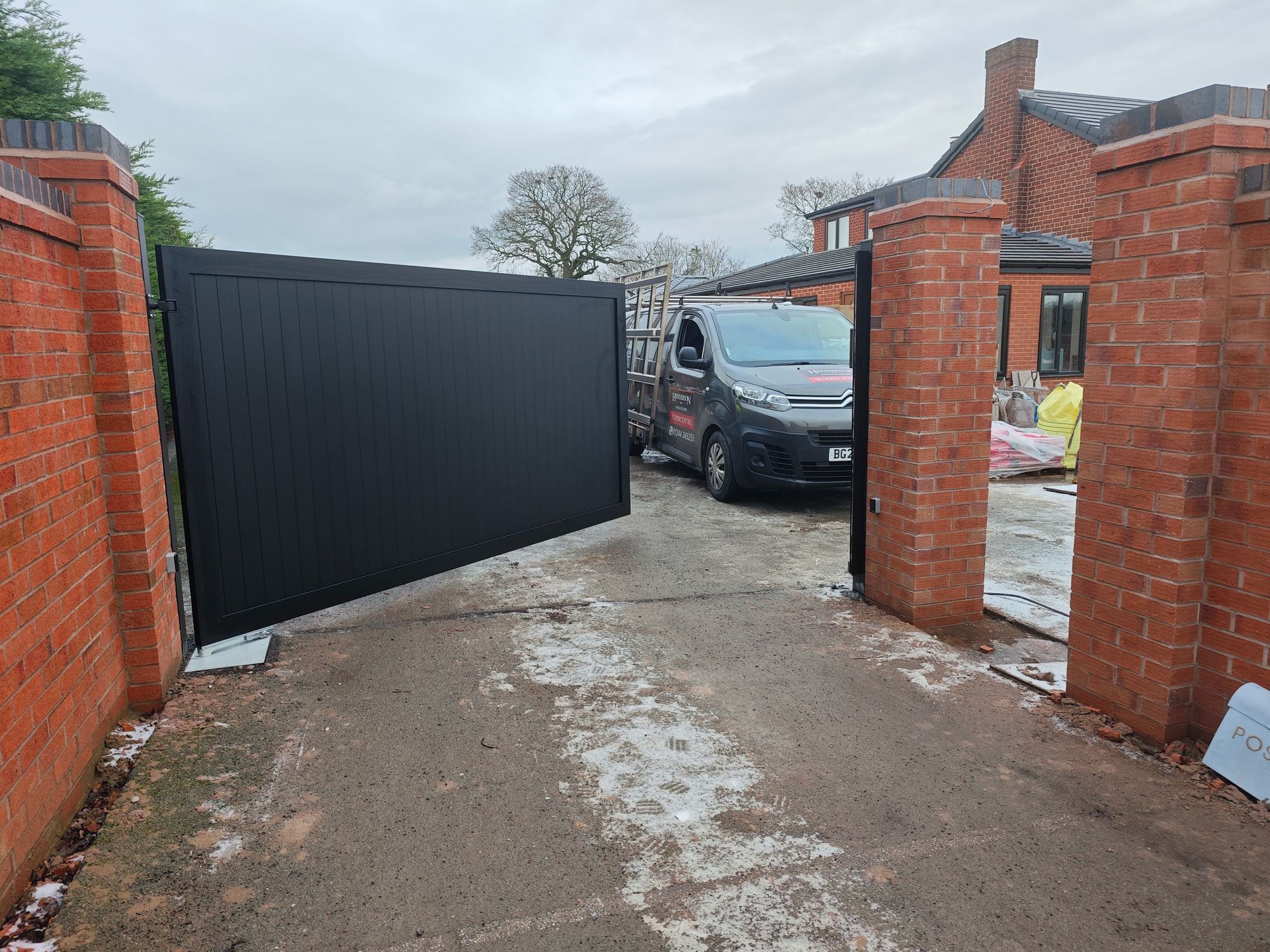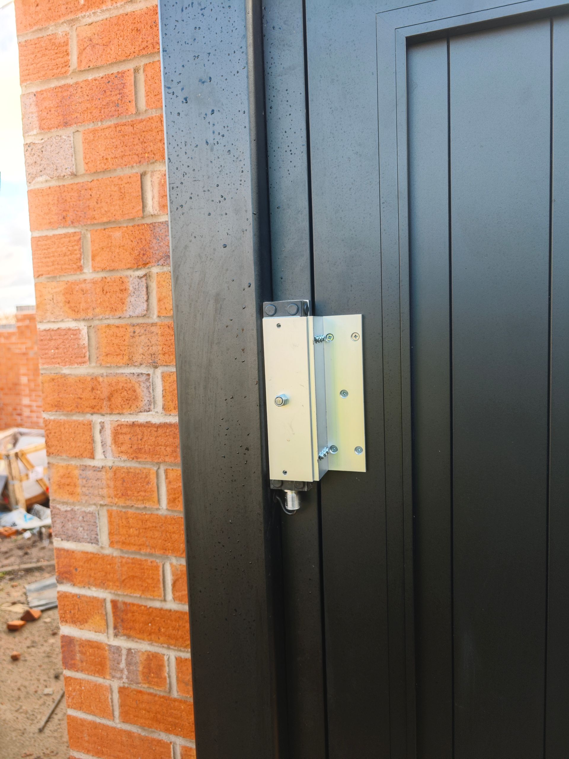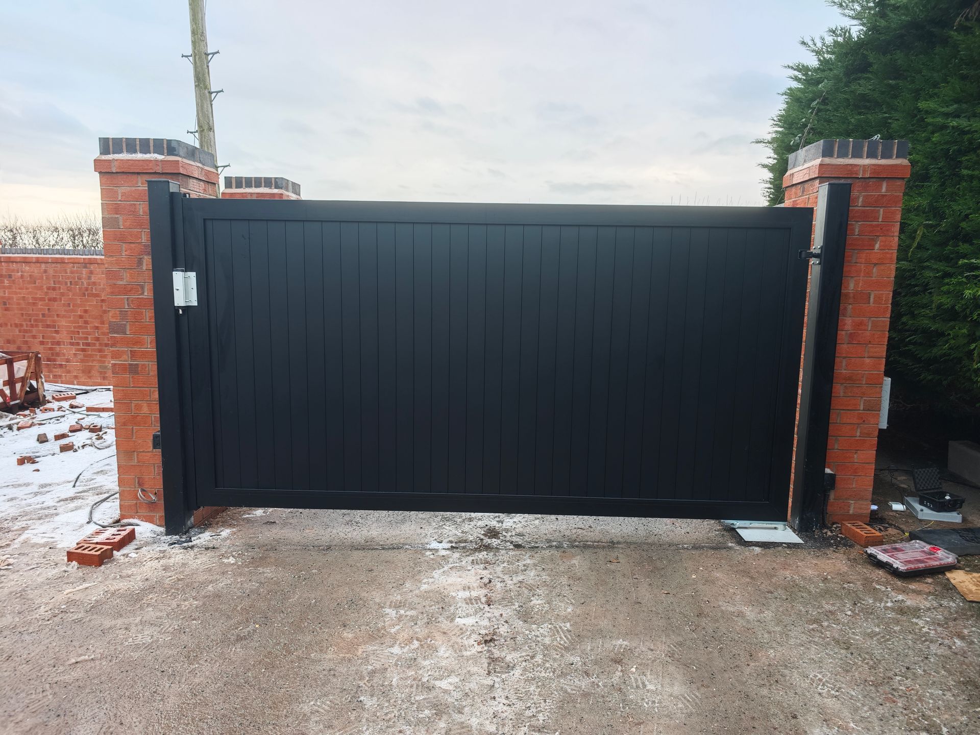 This large aluminium vertical style gate was finished in a standard textured black coating. Being 3.5m wide it was installed on galvanised steel support post's a Nice Big Fab heavy duty motor and to aid closing a magnetic lock was also fitted. Operation is by remote control handsets on a press to open press to close basis.