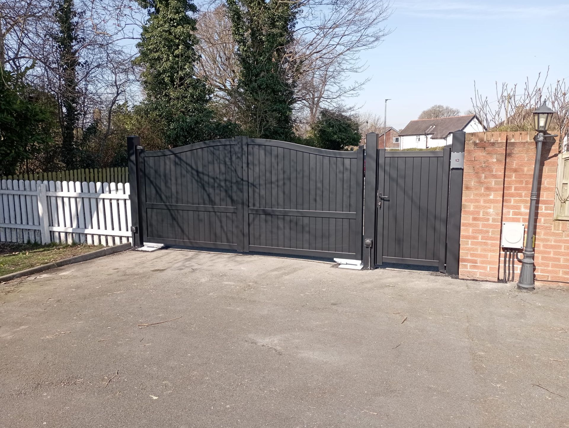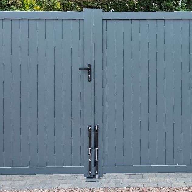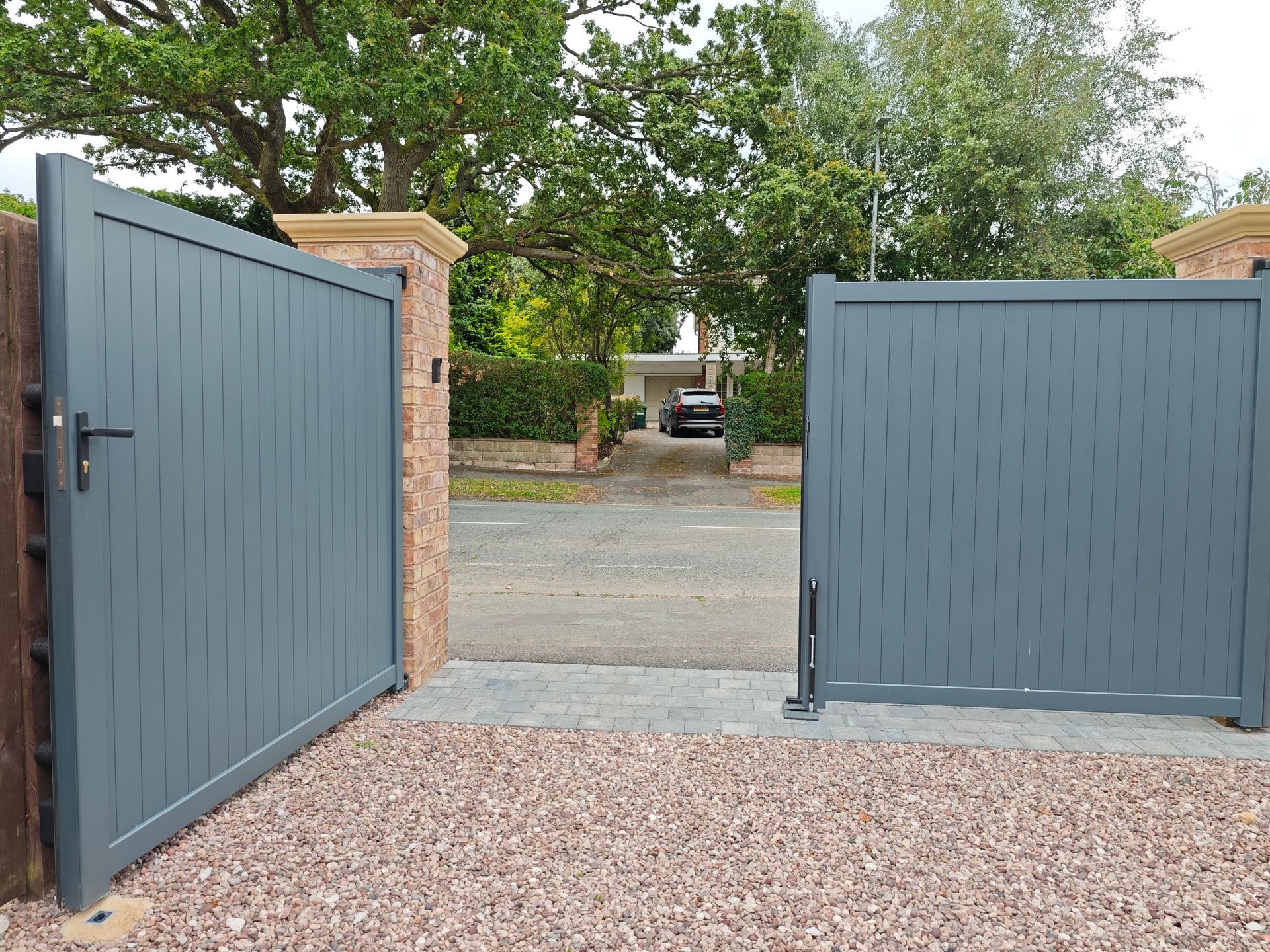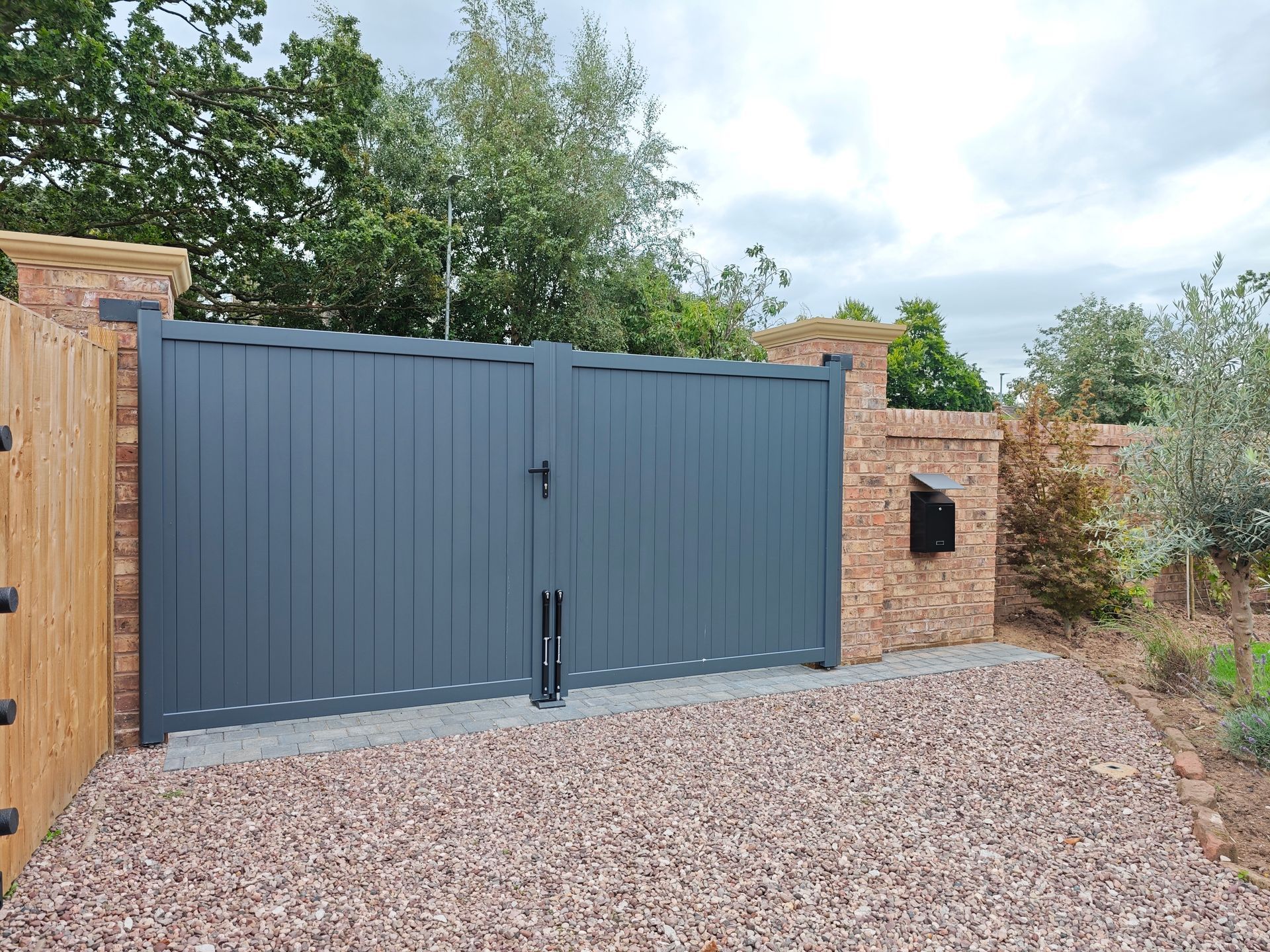 Manual aluminium gates in anthracite with flat top and vertical infill. Gates have a handle and eurolock as standard which was supplemented with Locinox lockable drop bolts. These can be used to secure the gates in the closed position as well as retaining them when opened.