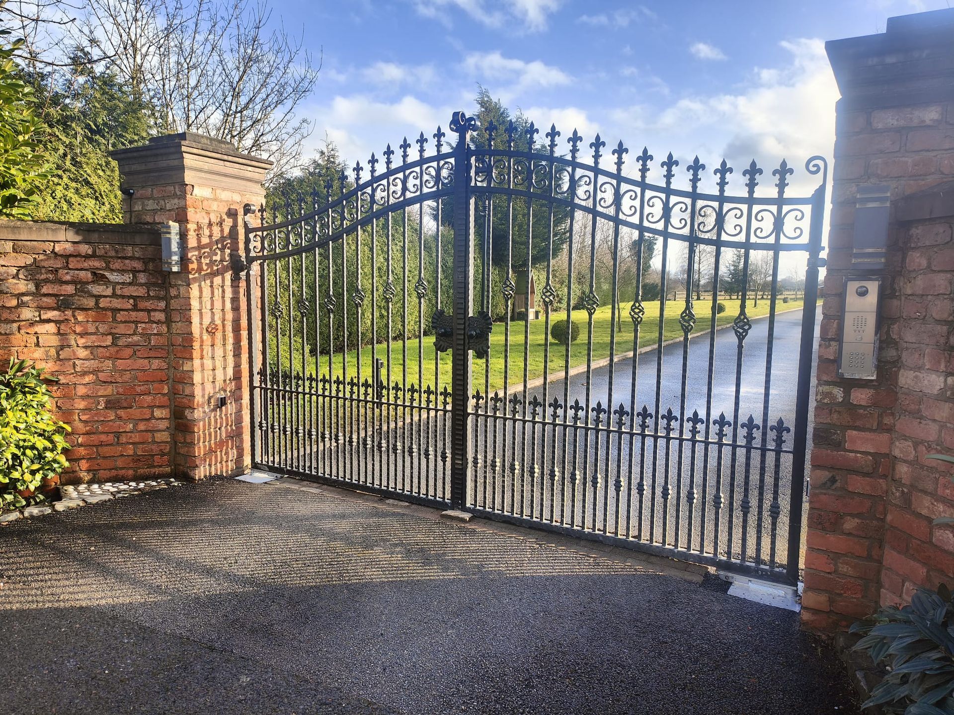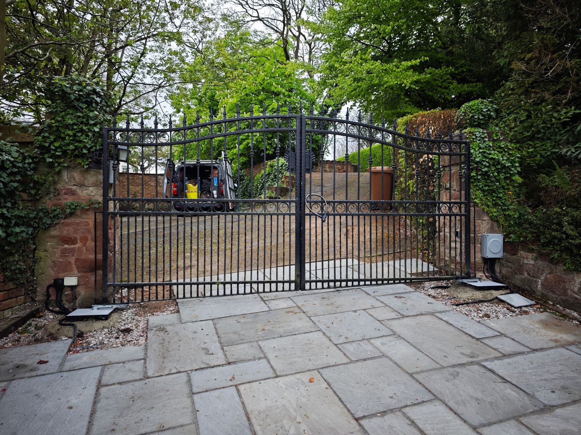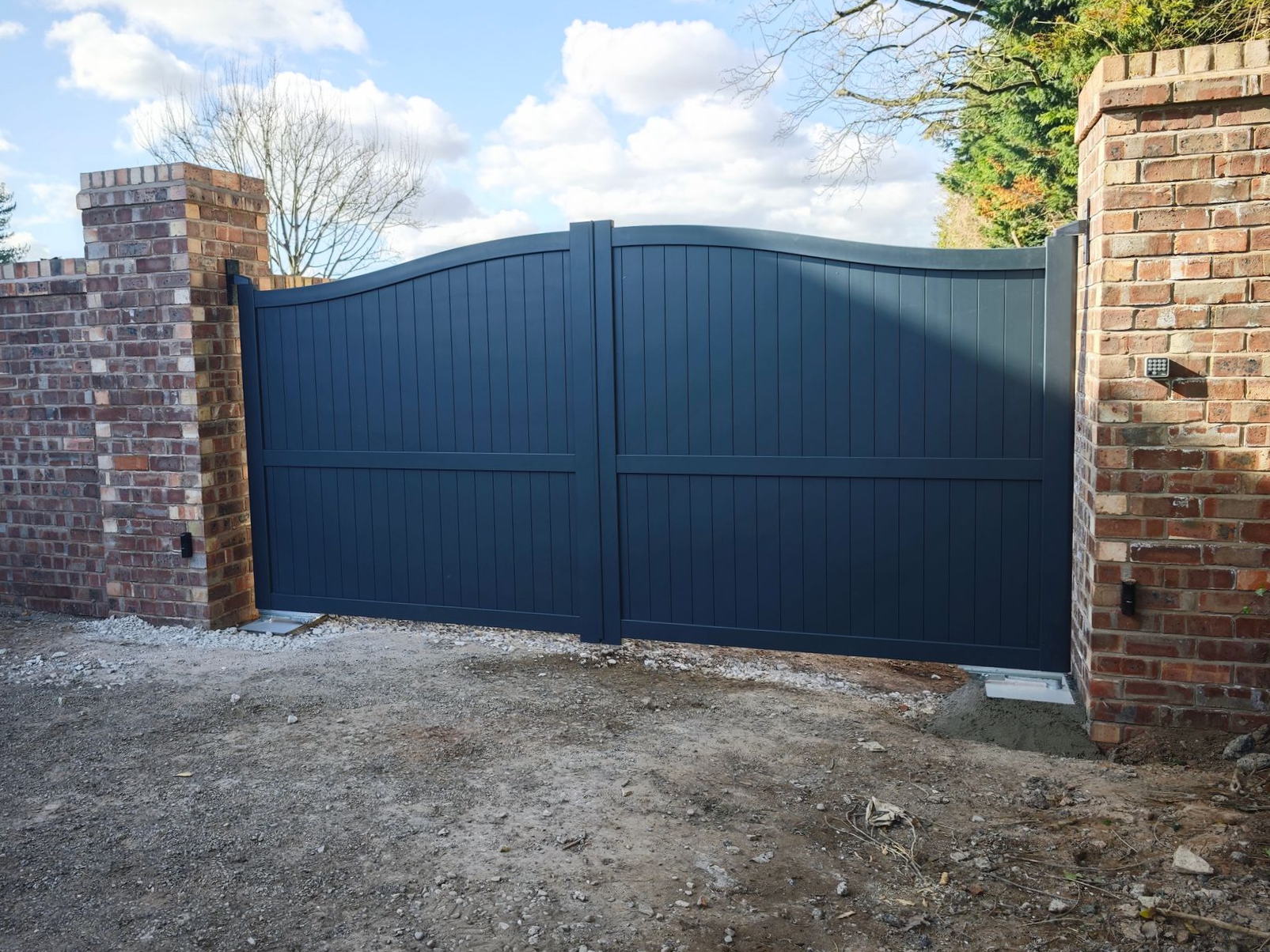 Manual aluminium gates in anthracite with flat top and vertical infill. Gates have a handle and eurolock as standard which was supplemented with Locinox lockable drop bolts. These can be used to secure the gates in the closed position as well as retaining them when opened.