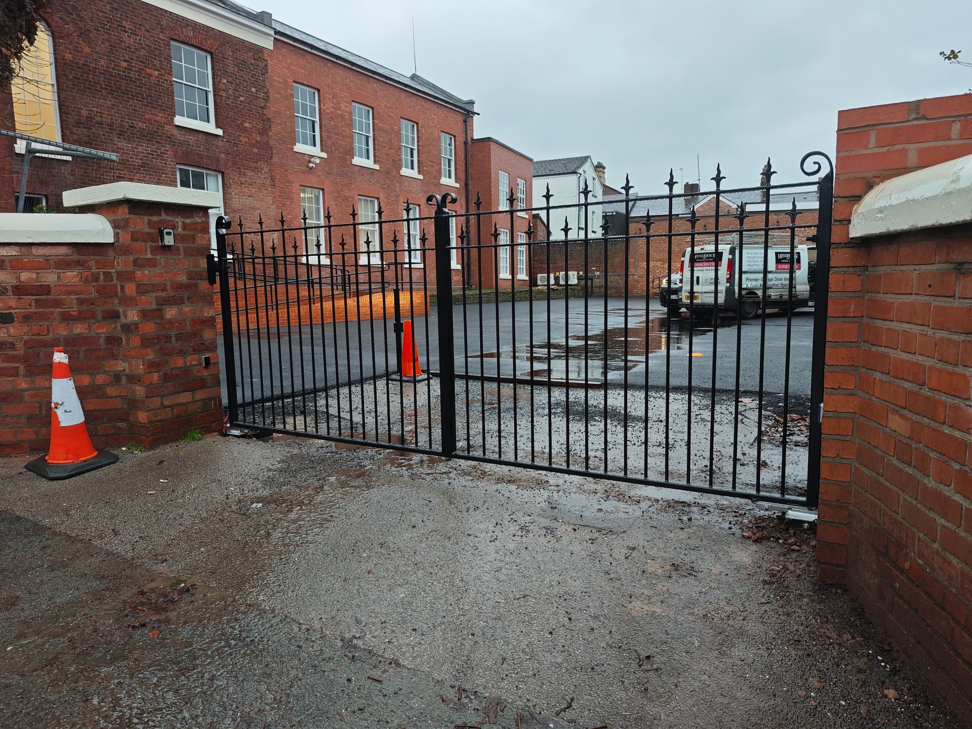 Manual vertical infill gates with extra Locinox dropbolts to the inside. Mounted to new brick piers with small spreader plates.