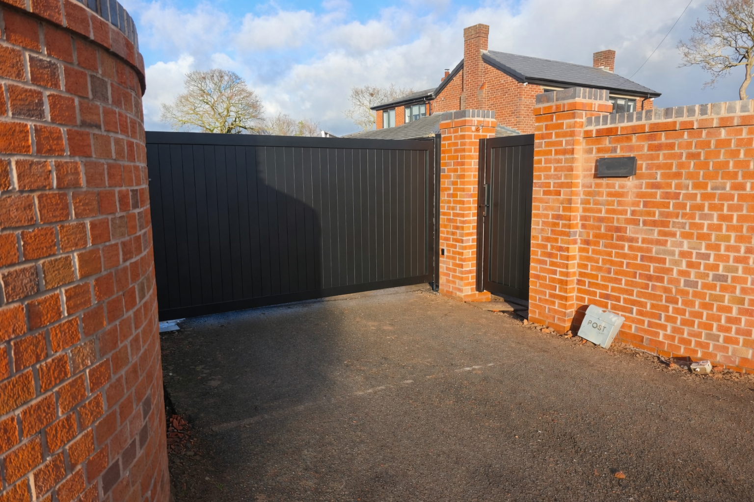 Motorised driveway gates mounted to matching aluminium post's with the addition of a pedestrian gate for visitors and deliveries.