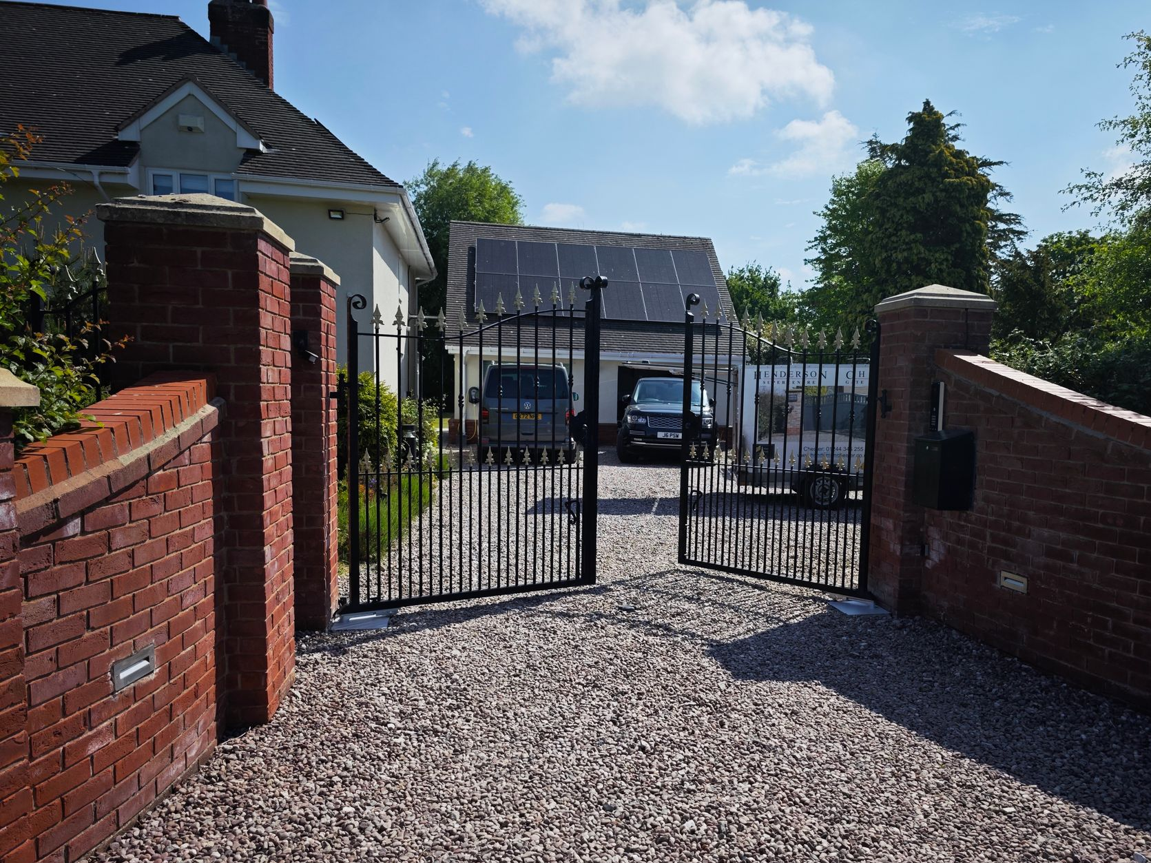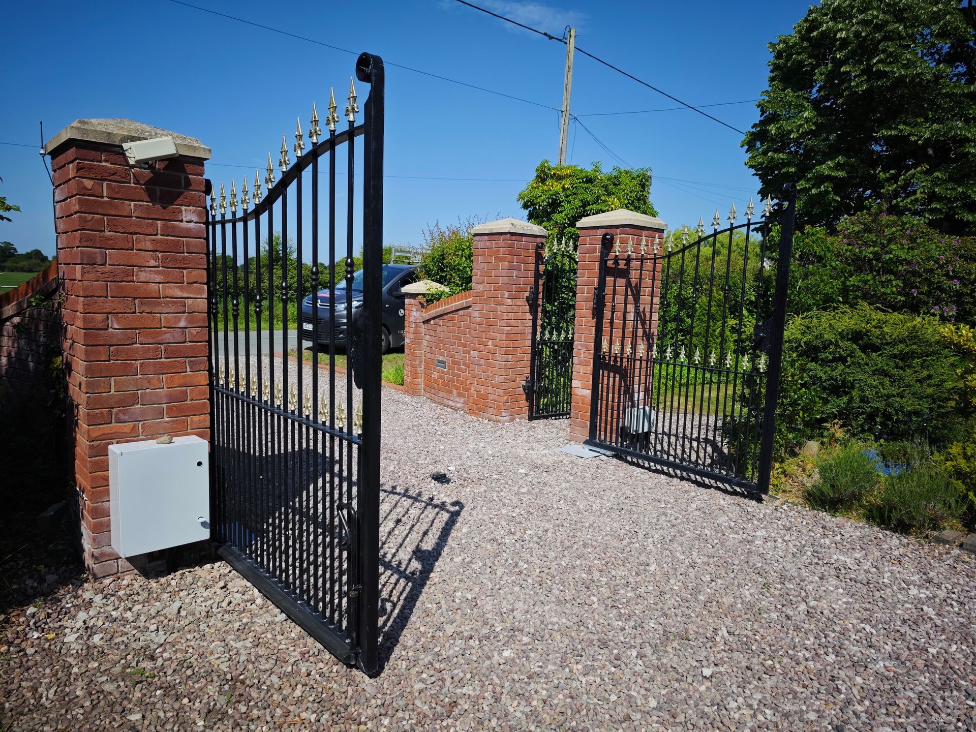 Original underground operators removed and replaced with Nice L Fab 24volt units. The gates were re-aligned when installed so the central spar's looked correct. New control cabinet and wiring through out along with safety photocell beams installed and existing safety edges kept.