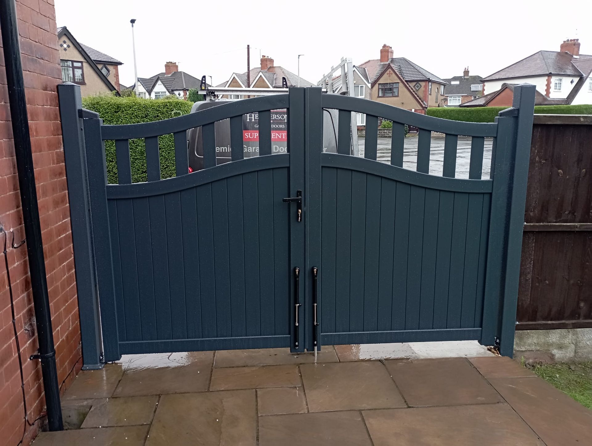 Premade aluminium Bell Curve top swing gates in anthracite finish installed in Whitby near Chester.