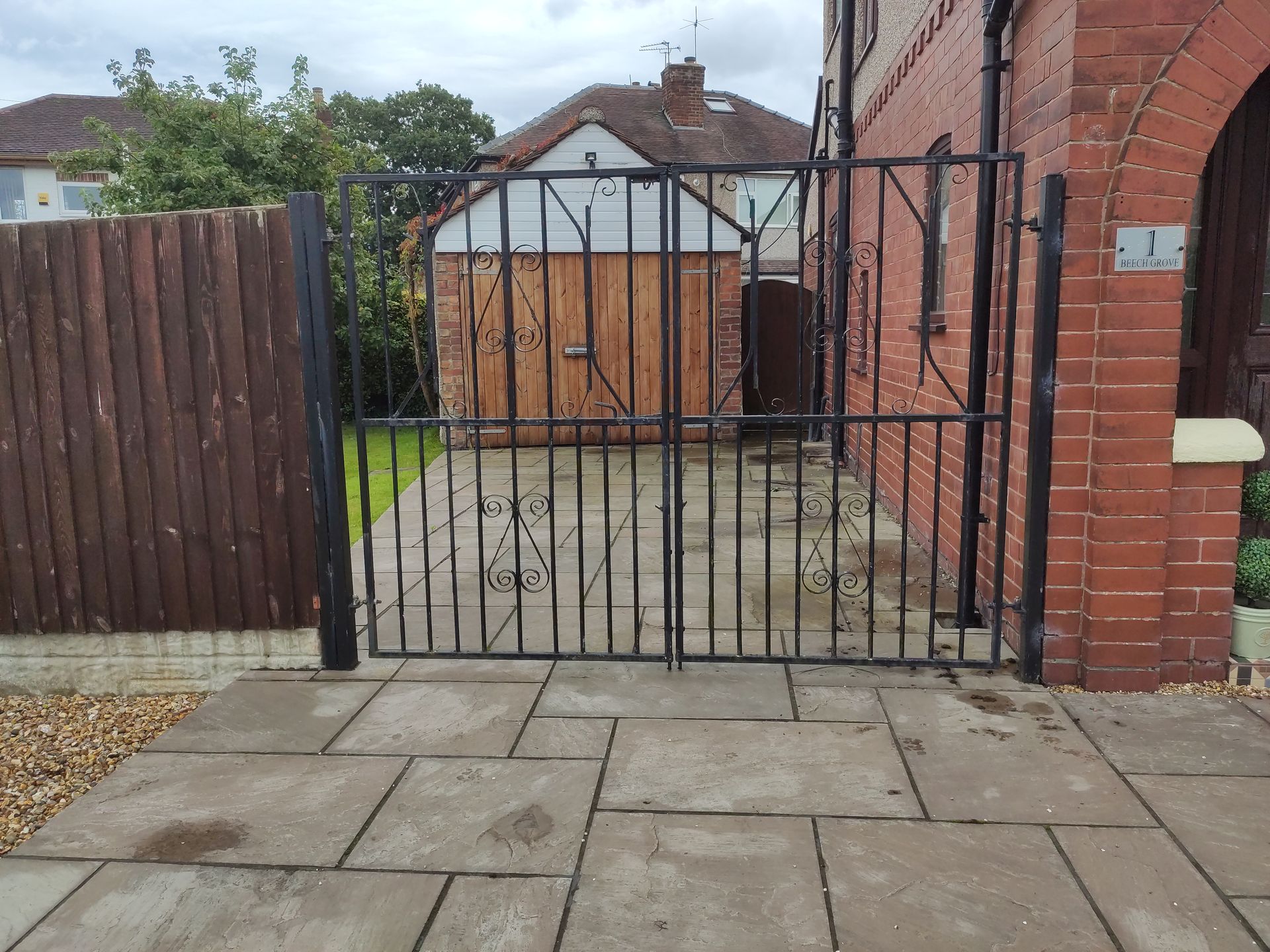The Customer was advised to increase the width of the gate to maximise the drive through width. As per the picture below the old wrought iron gate was removed along with the post passing through the Indian stone flag. A new post was installed and the existing wooden fence and concrete bottom panel were trimmed to meet the new aluminium post as well as a new Indian stone flag to replace the one with a whole in it.