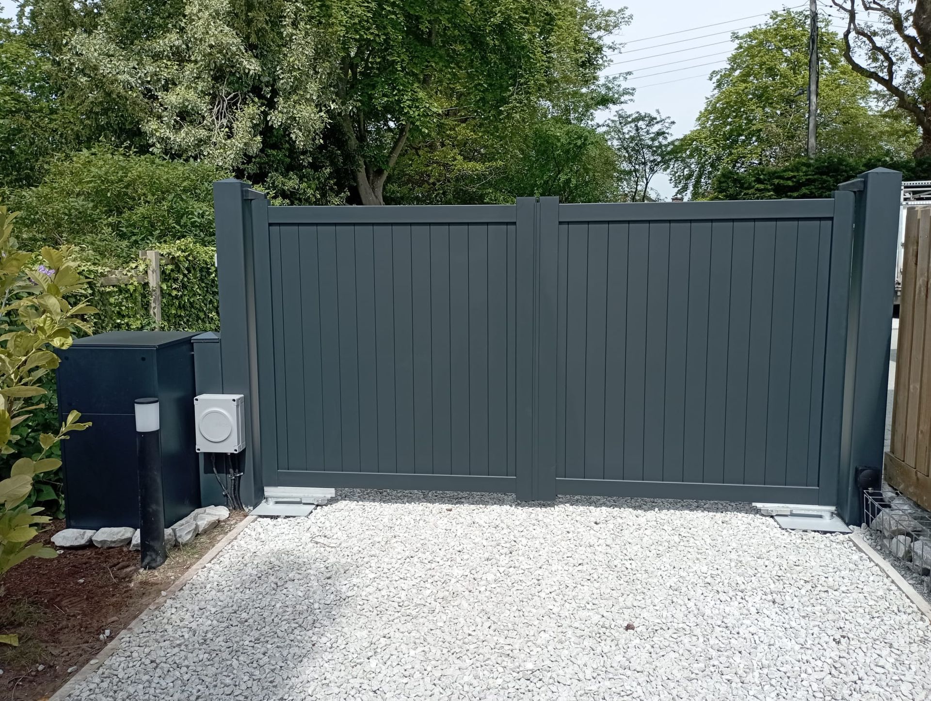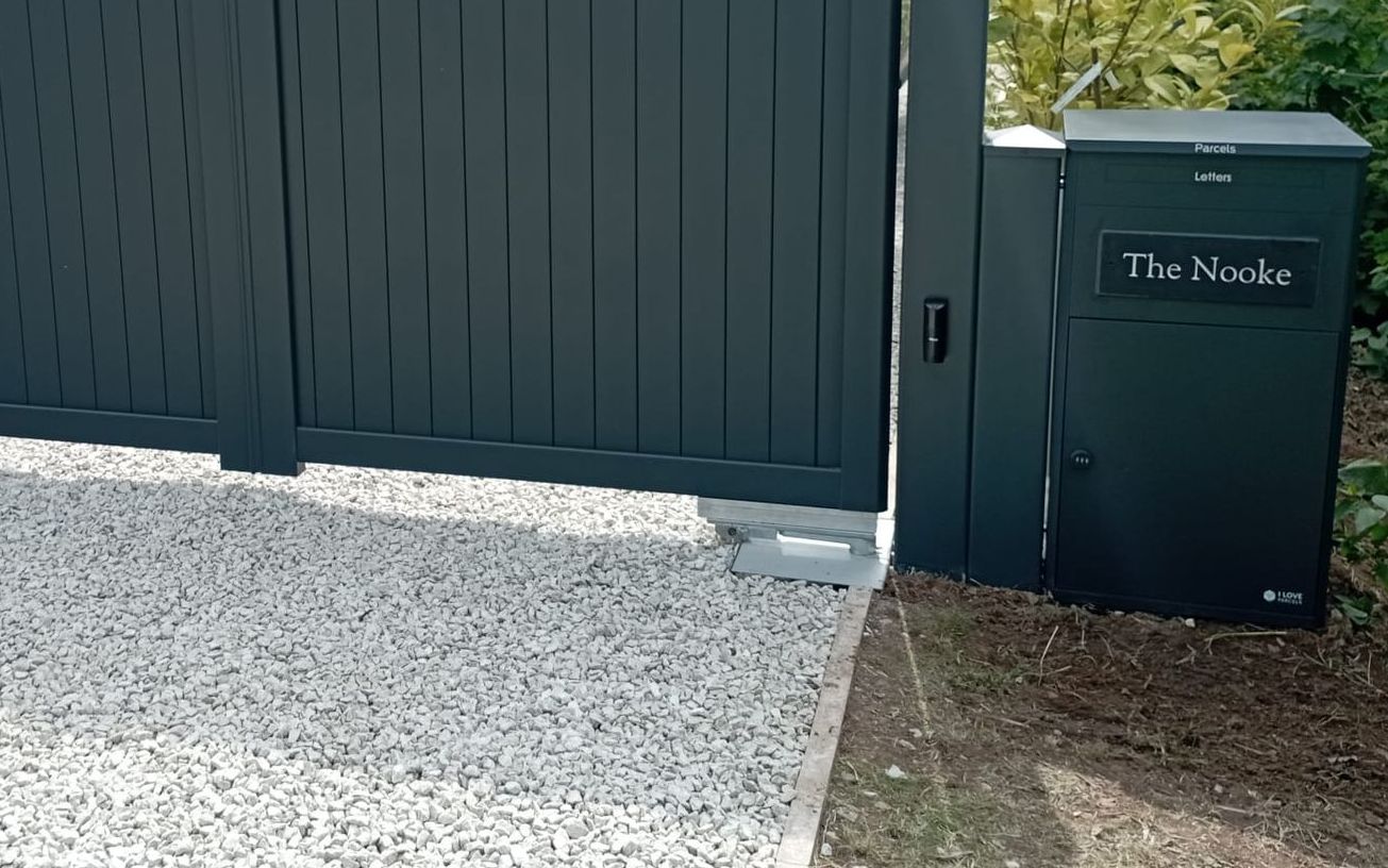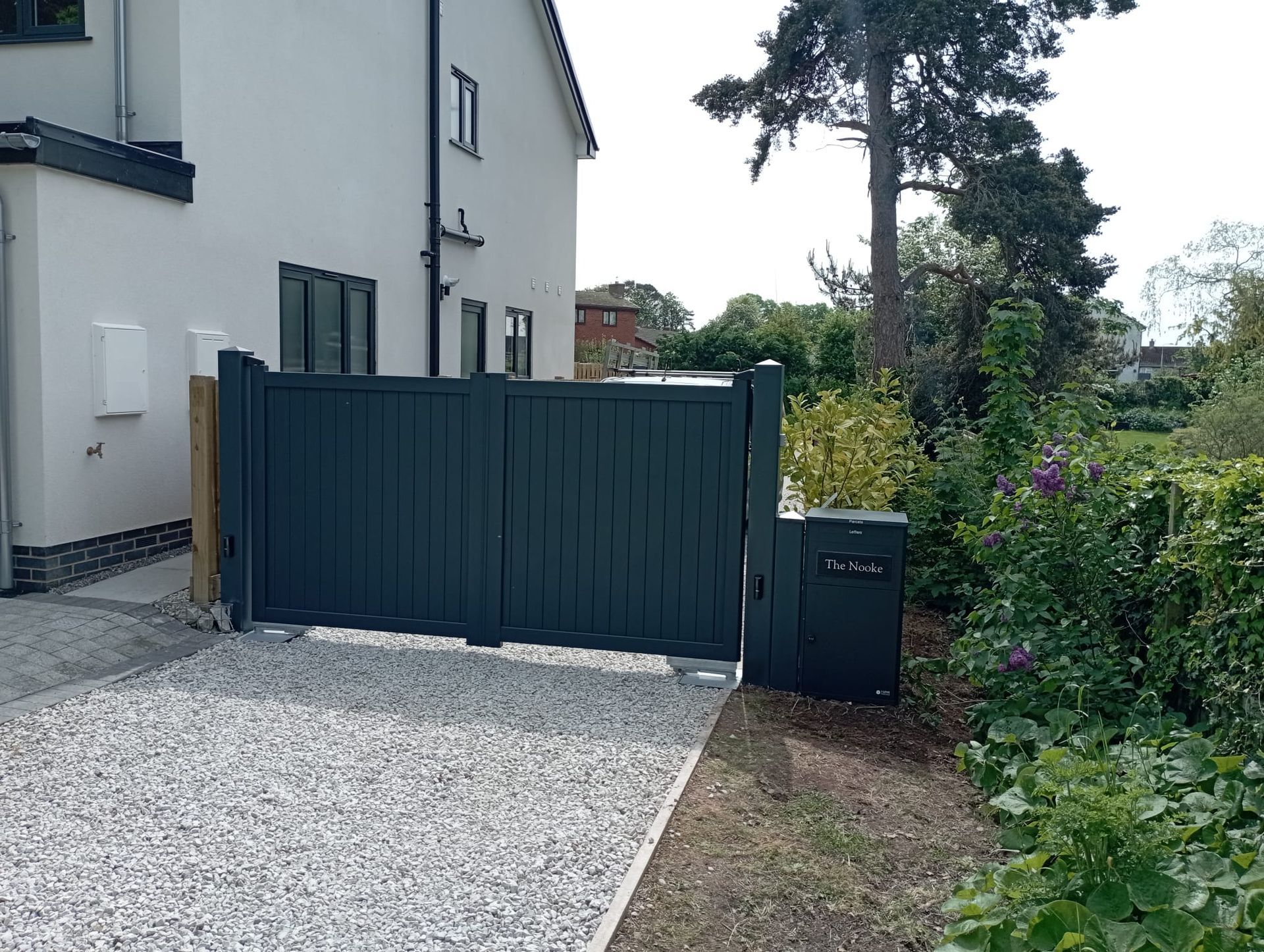 Aluminium gates in anthracite with matching 150mm square posts concreted into the ground. As the drive sloped away to one side extra aluminium packers were required underneath one gate leaf so that the Nice 24 motors could be installed flush with the ground level. The customer ordered post box was installed as a courtesy while we were on site.