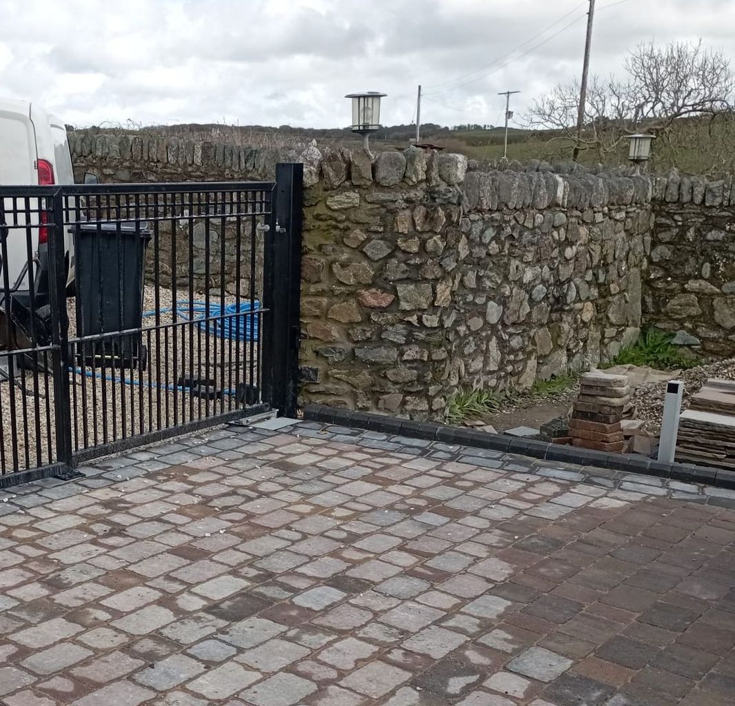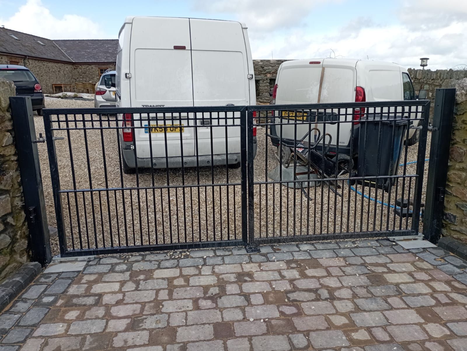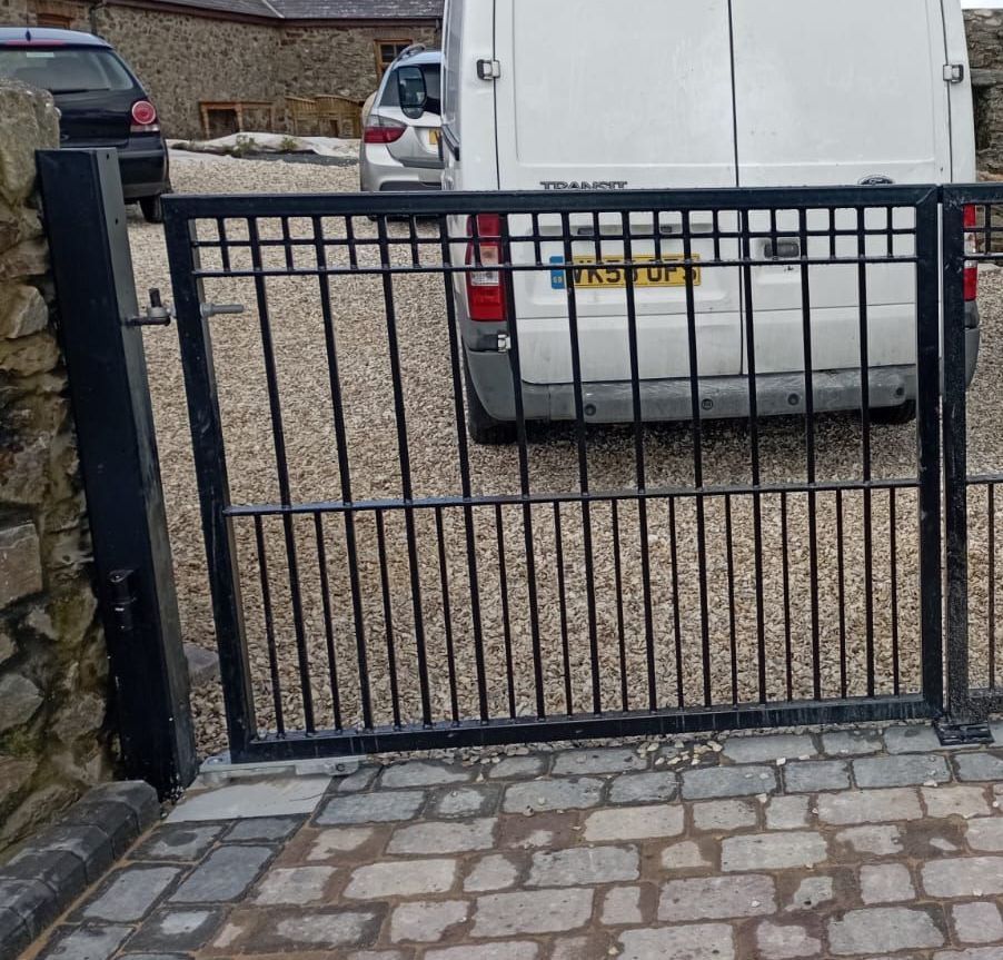 Aluminium Bell Curve Top Pre-made gates with manual operation mounted to sandstone pillars in Heswall on the Wirral. These gates required aluminium packing plates on the sandstone pillars to ensure solid fixings and to provide a level of adjustment due to the age of the pillars. The gates have a standard euro lock and central handle which was supplemented with Locinox lockable drop bolts to each gate leaf.