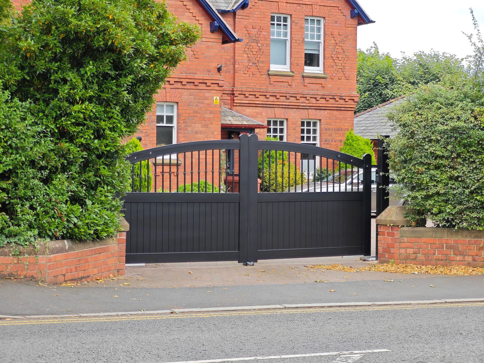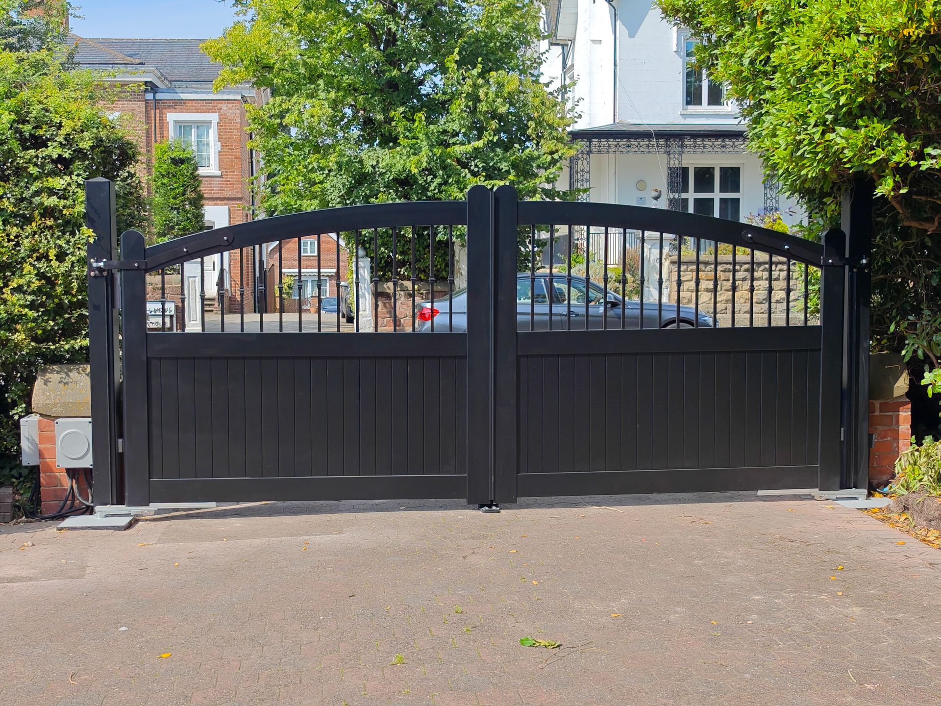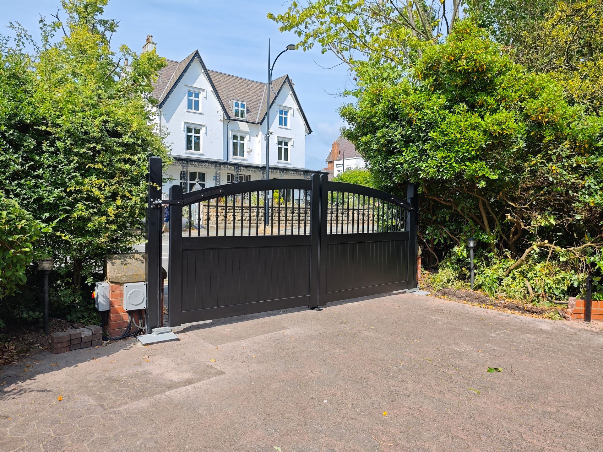 Aluminium gates in black with matching 150mm square aluminium posts concreted into the ground. Nice L Fab underground automation with extra aluminium packing on lower shoe to avoid catching the gravel drive.