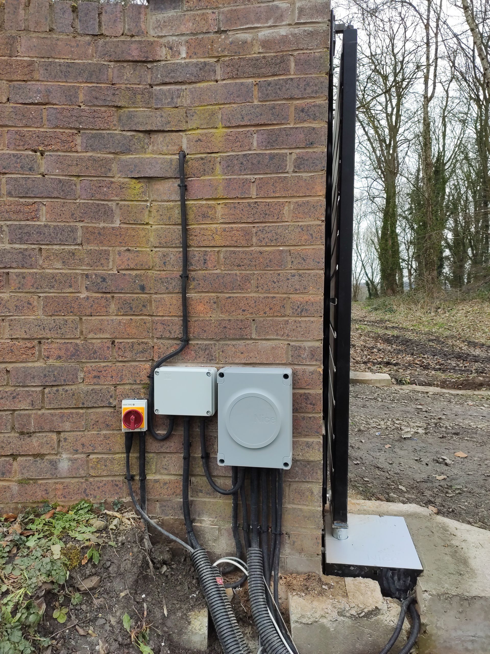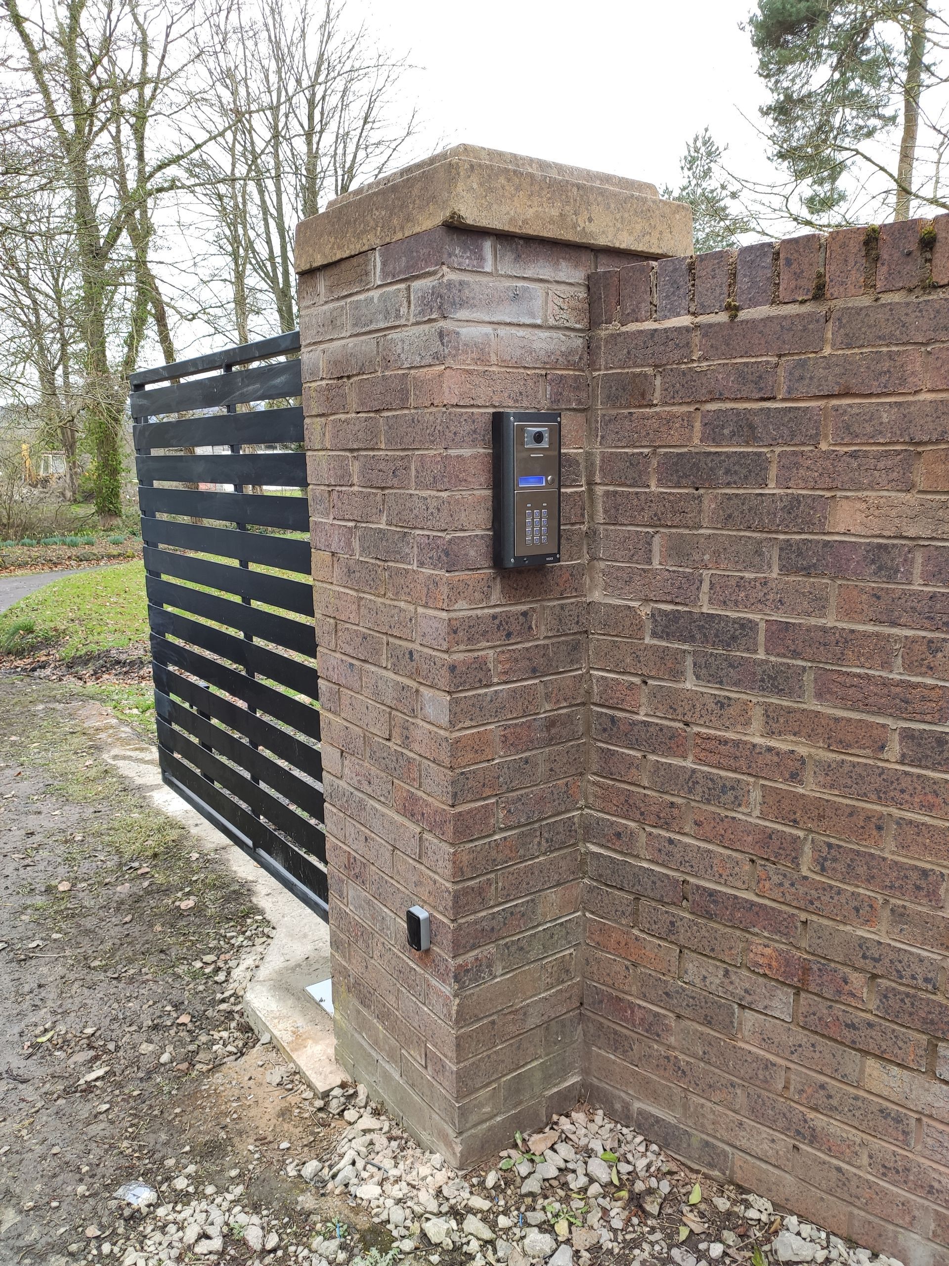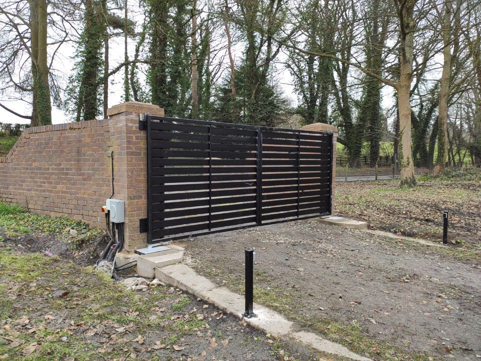 Existing manual gates were removed and shot blasted before being powdered coated black. Then mounted to new steel post's set behind the existing brick piers. Nice L fab underground automation was installed along with an AES exit loop and safety devices.