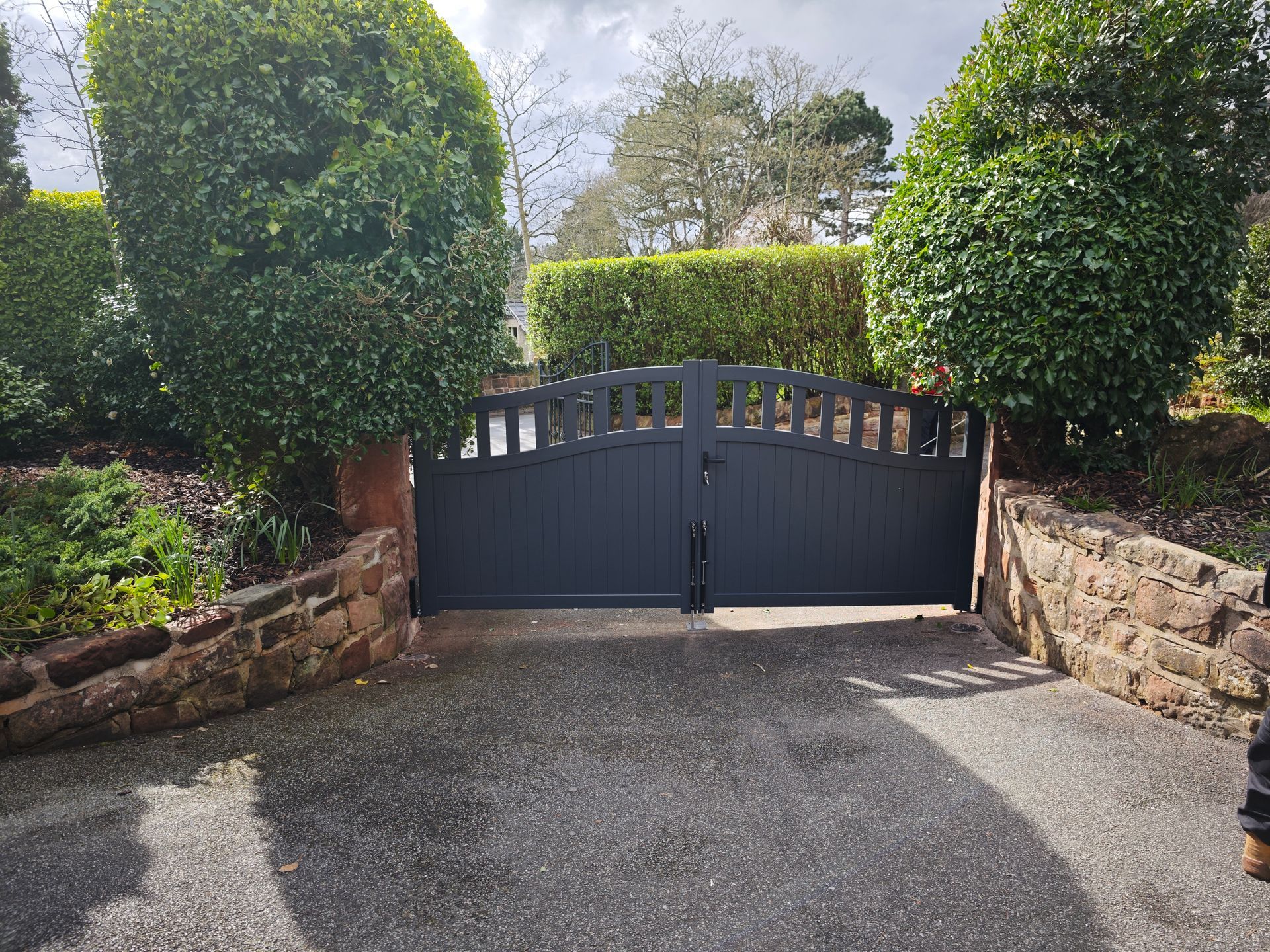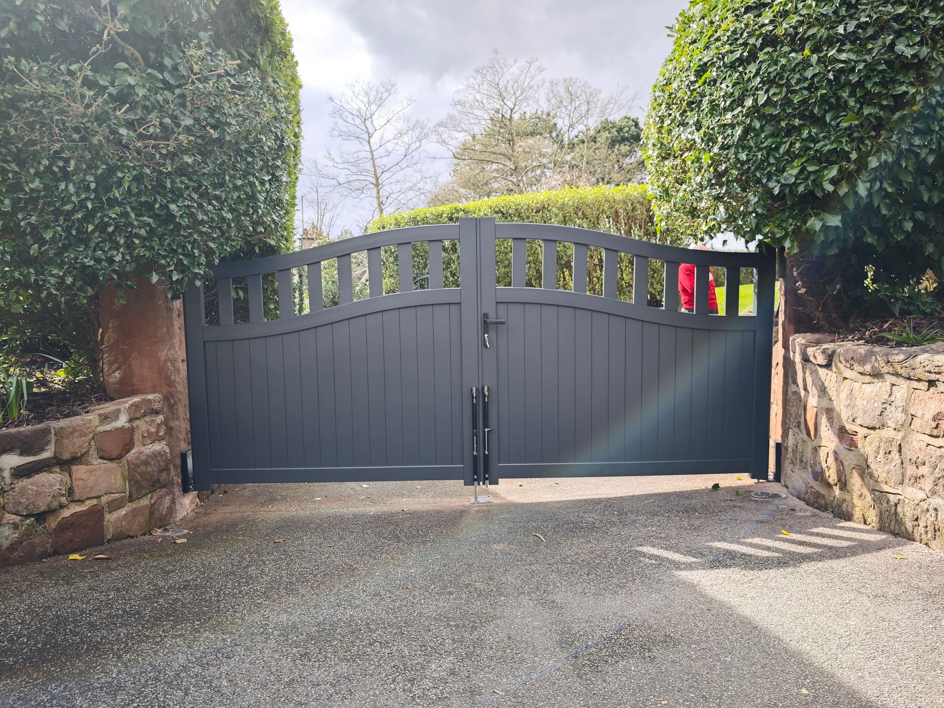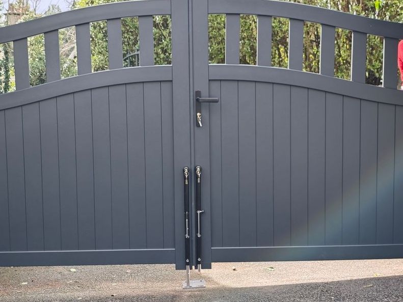 Aluminium Bell Curve Top Pre-made gates with manual operation mounted to sandstone pillars in Heswall on the Wirral. These gates required aluminium packing plates on the sandstone pillars to ensure solid fixings and to provide a level of adjustment due to the age of the pillars. The gates have a standard euro lock and central handle which was supplemented with Locinox lockable drop bolts to each gate leaf.