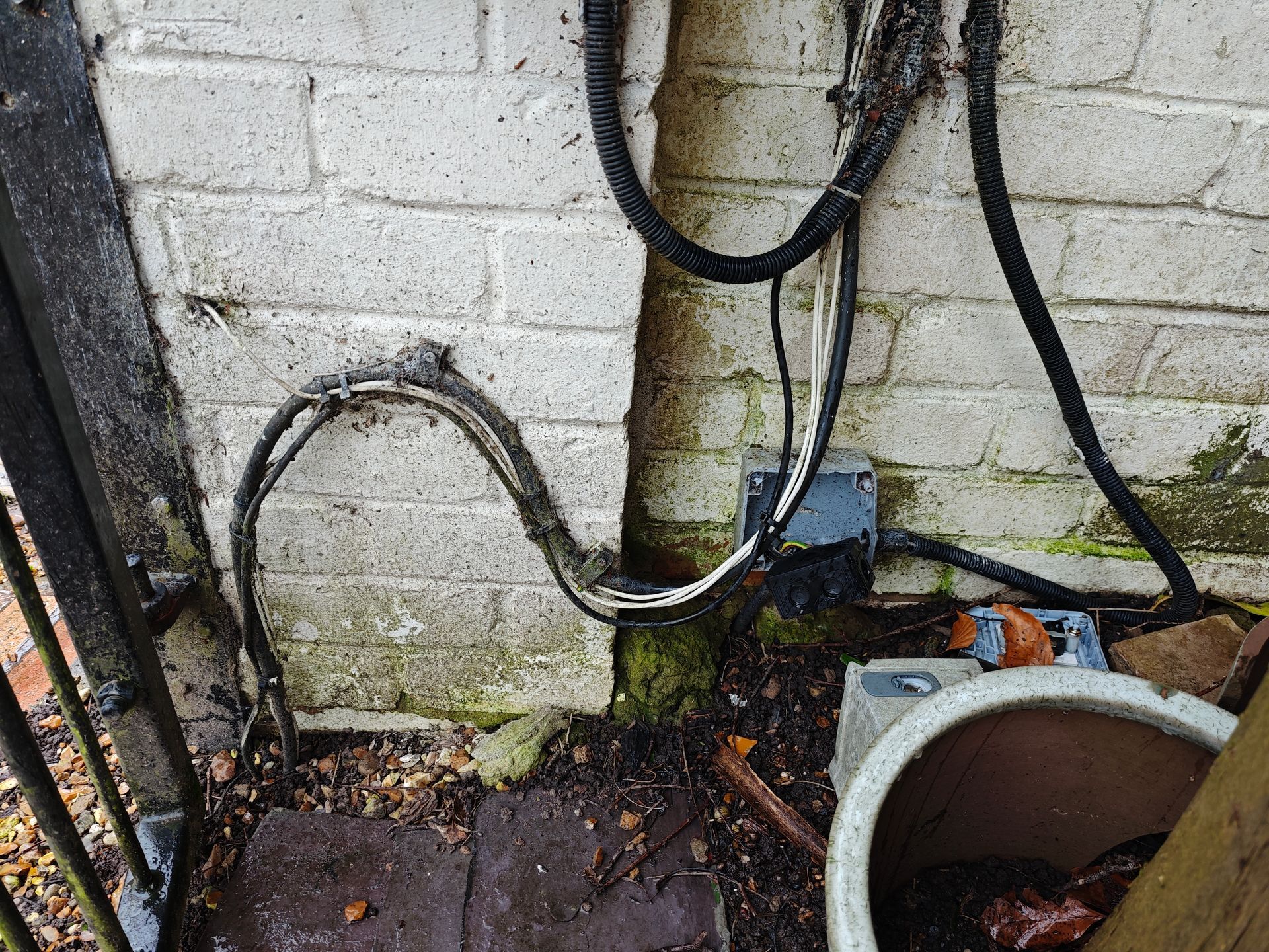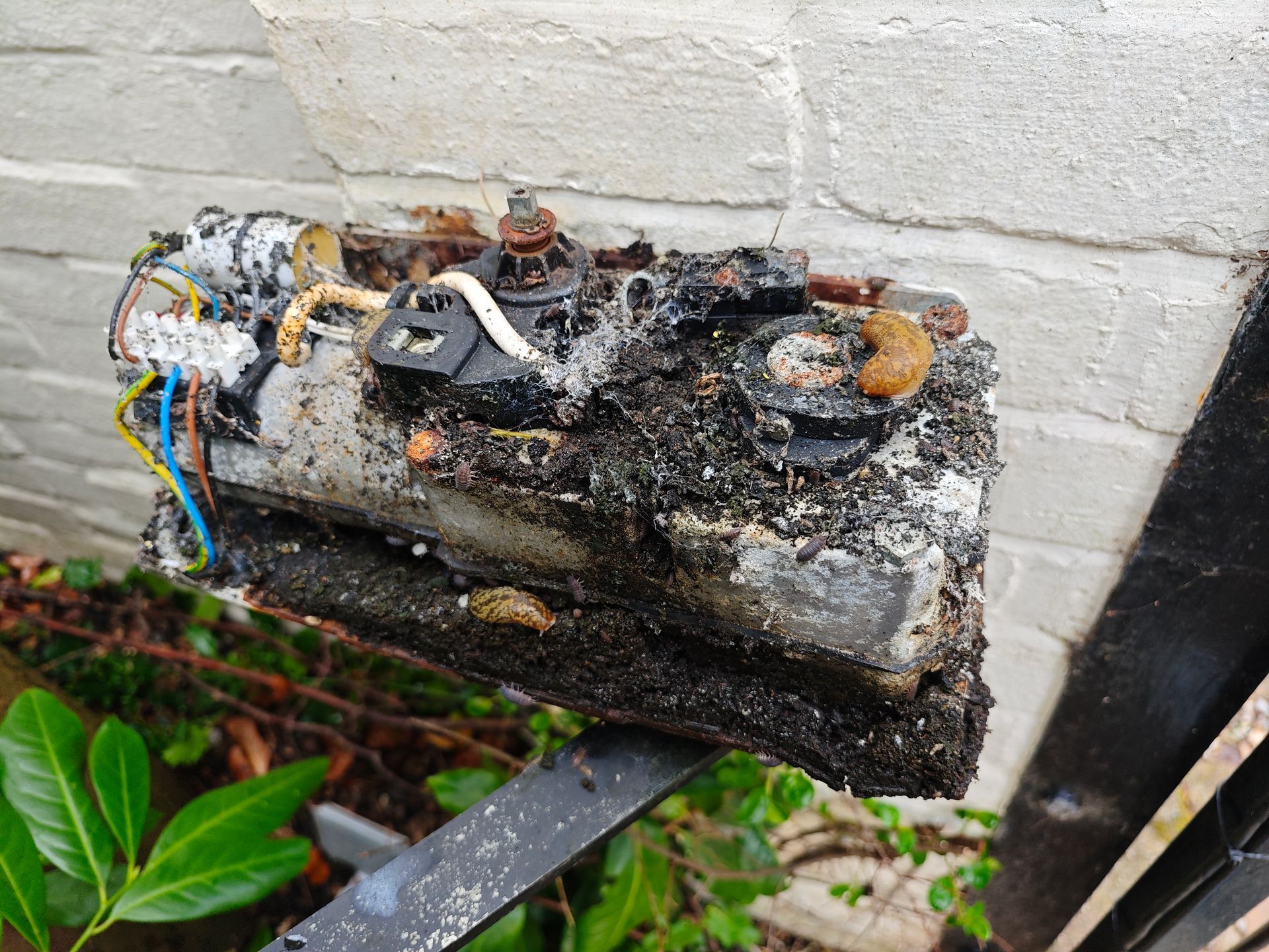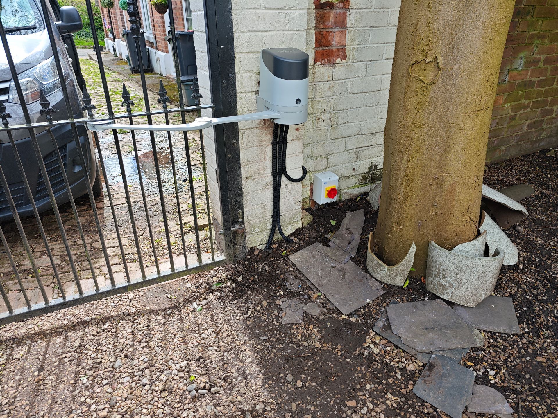 Customer had another company attend the gate installation, they replaced the isolation point with a junction box in an attempt to get the motors working. This didn't work so they then disappeared. We replaced the motors with Nice Hopp 24 volt automation, new wiring throughout, safety photo cells and installed a rotary isolation point. As you can see from the motor picture nature has tried to make a home.