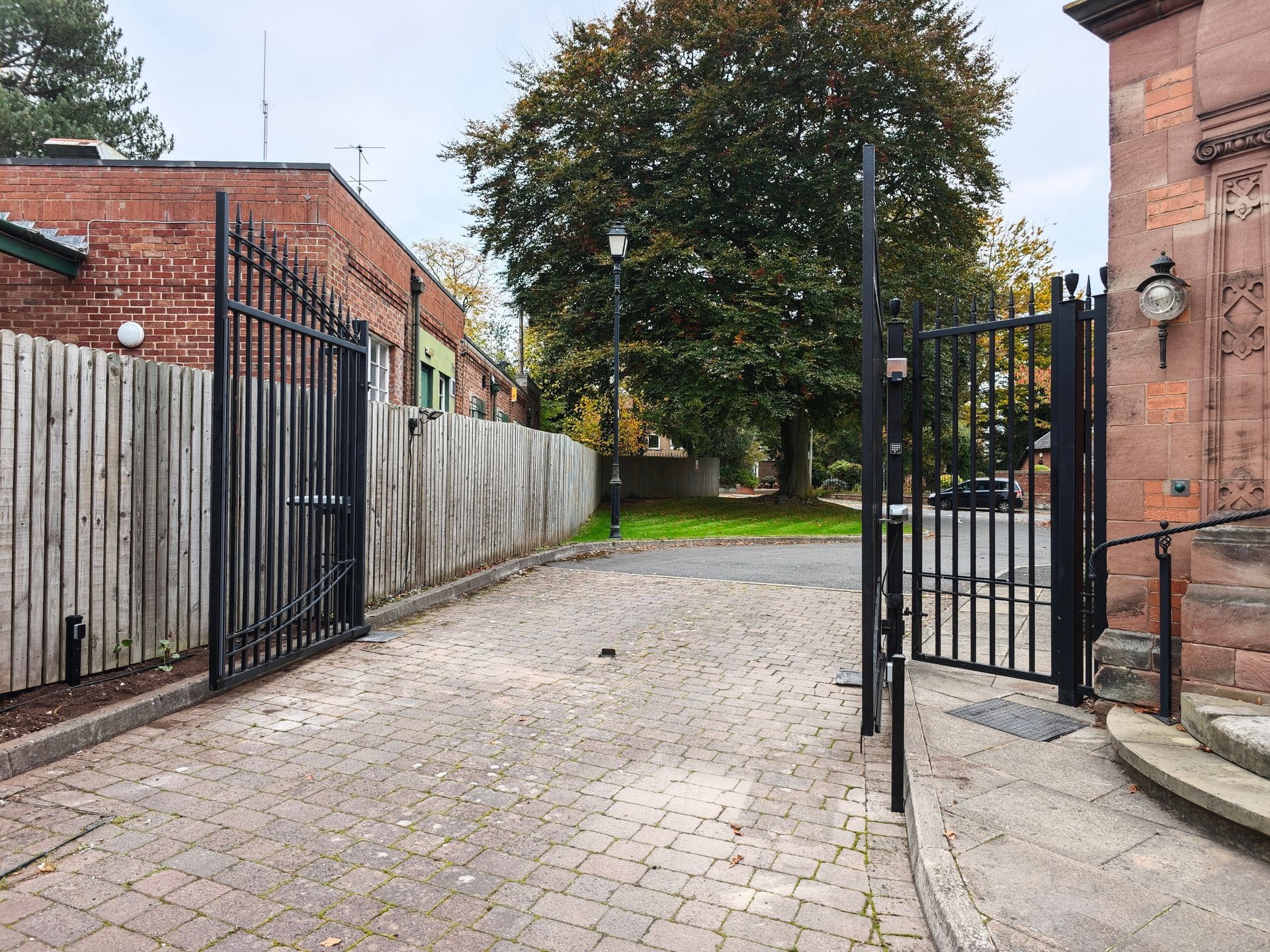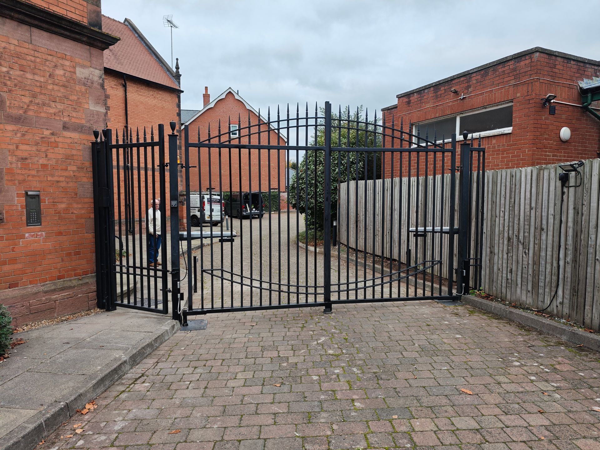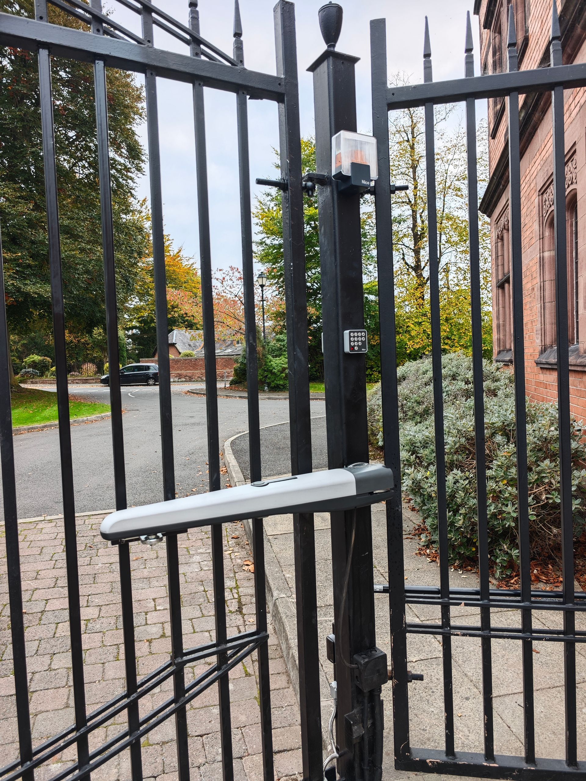 Vehicle impact had damaged the existing gate motors so we replaced them with Nice Toona 24volt Rams. The main control unit was located in the building basement and the existing wiring was replaced as it was totally inadequate for the original and the new install. Safety edges, safety photo cells and a flashing light completed the install.