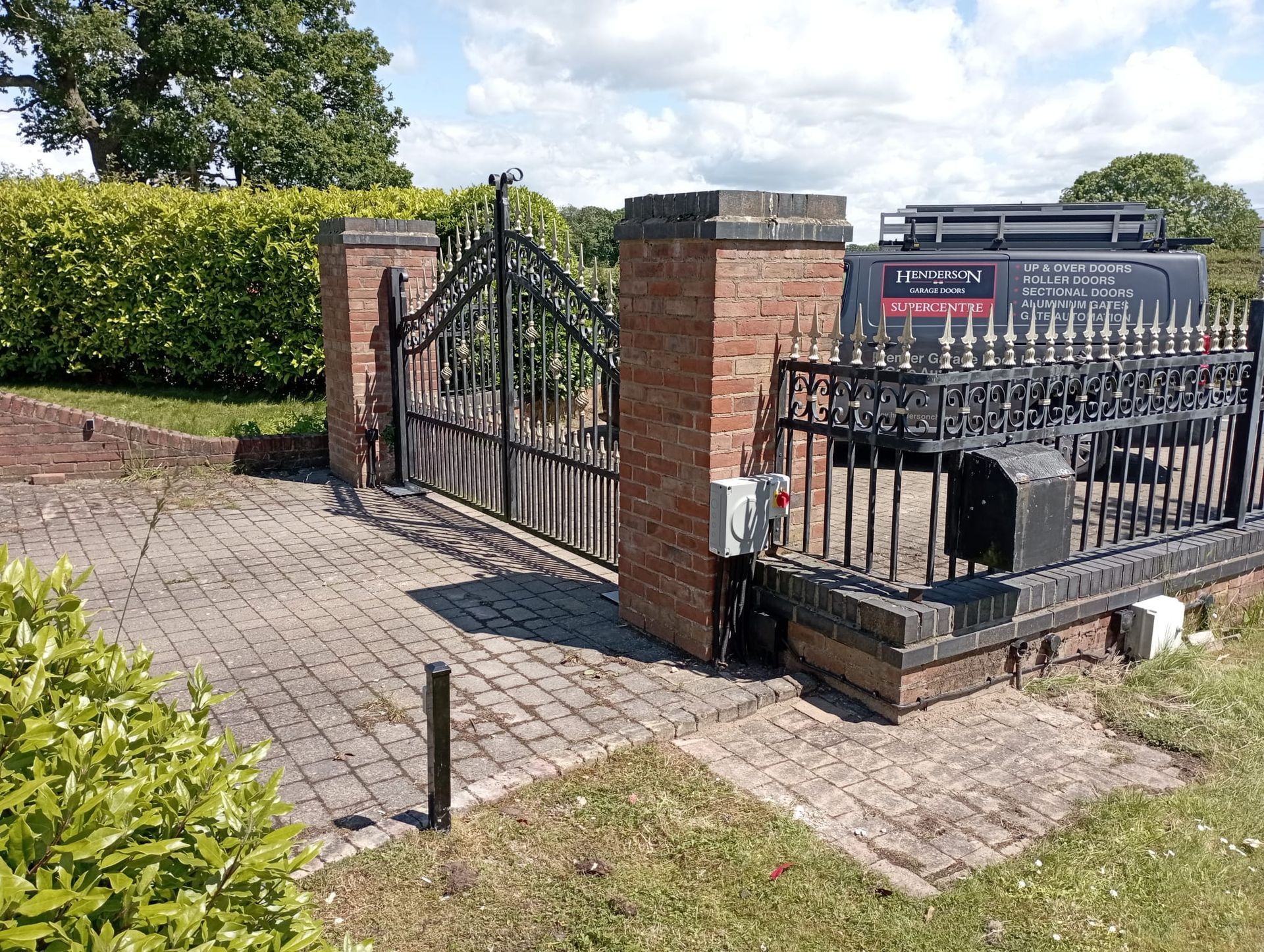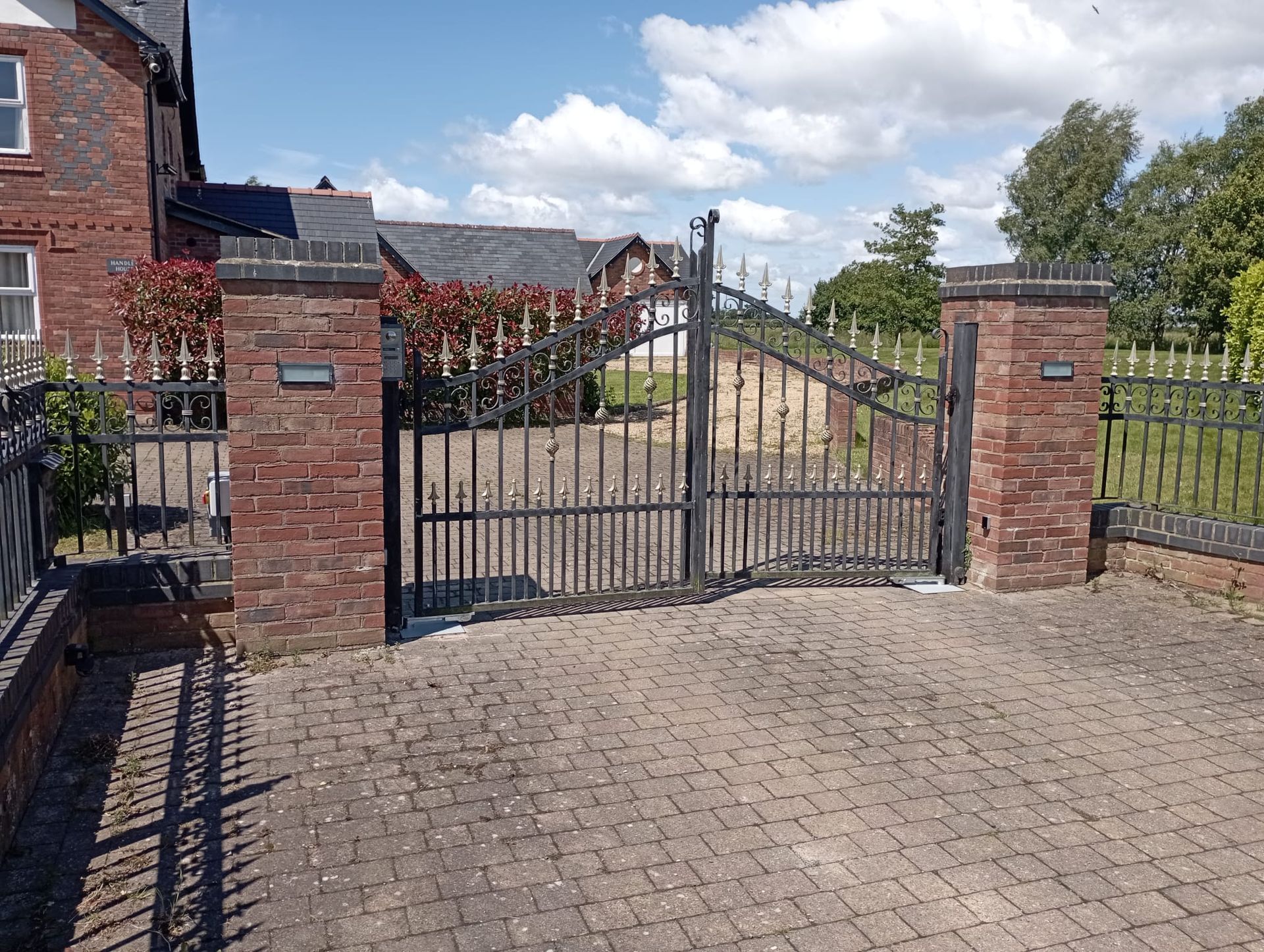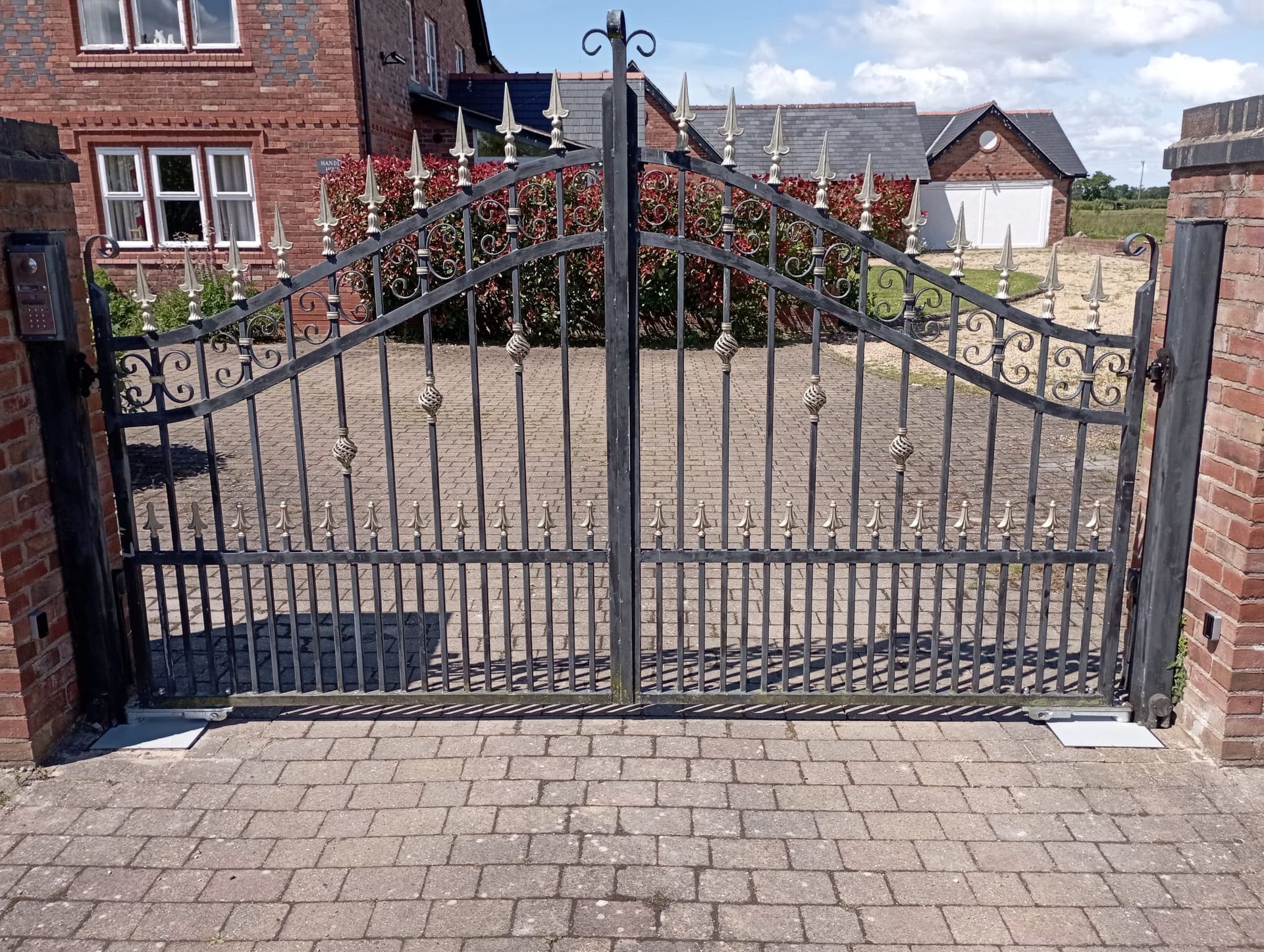 Existing manual gates were removed and shot blasted before being powdered coated black. Then mounted to new steel post's set behind the existing brick piers. Nice L fab underground automation was installed along with an AES exit loop and safety devices.