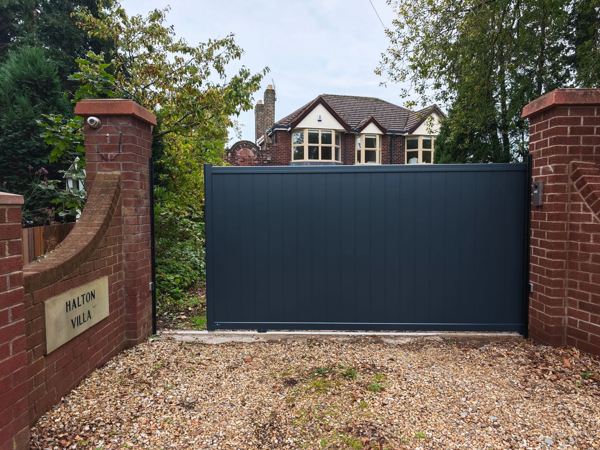 Sliding aluminium gate mounted to steel box section excavated into the ground. The gate is automated with a Nice Robus 600 motor with the addition of four pairs of safety photocells and two safety edges. Remote control key fobs and the addition of a Hikvision intercom provide easy use.