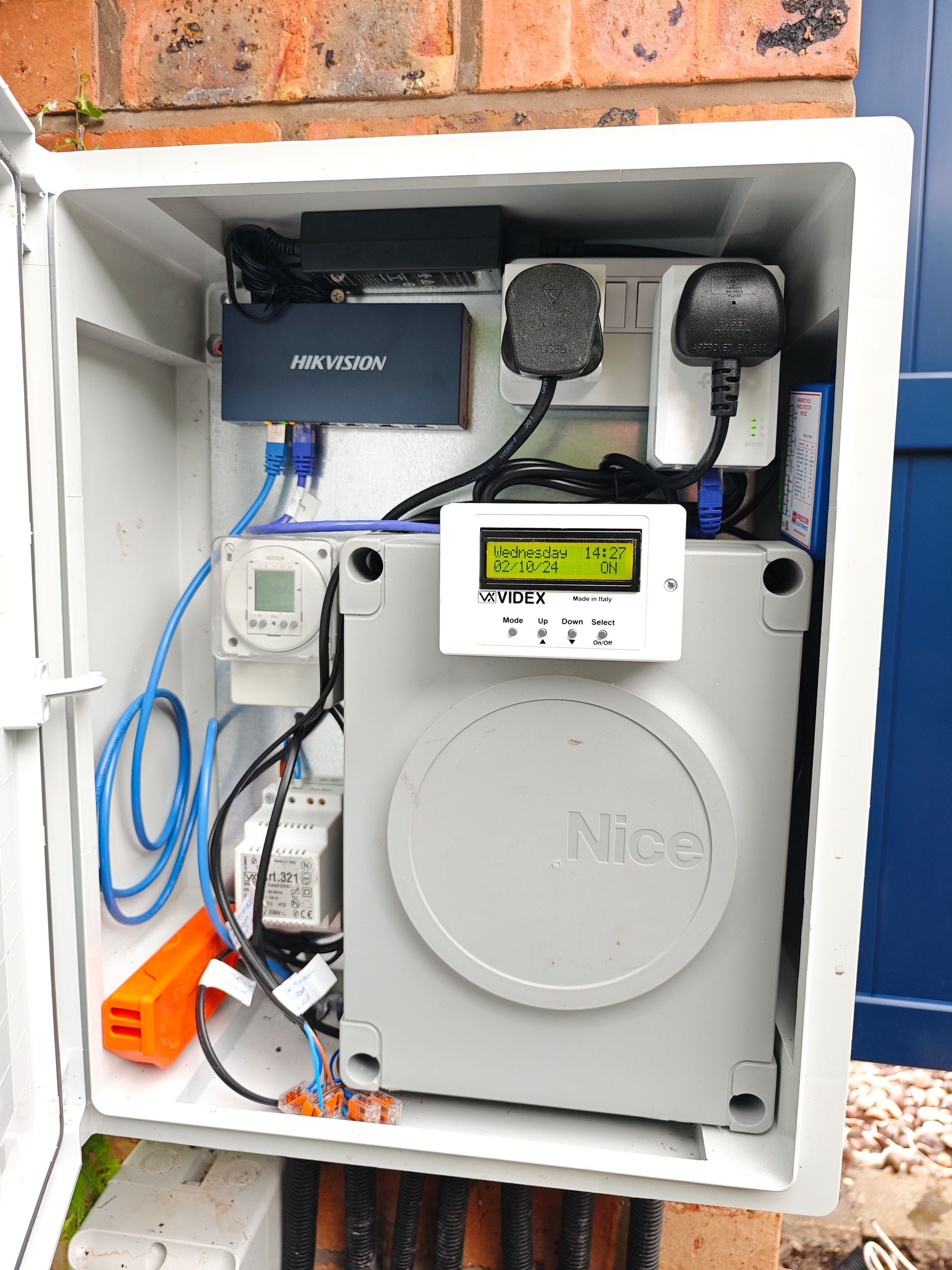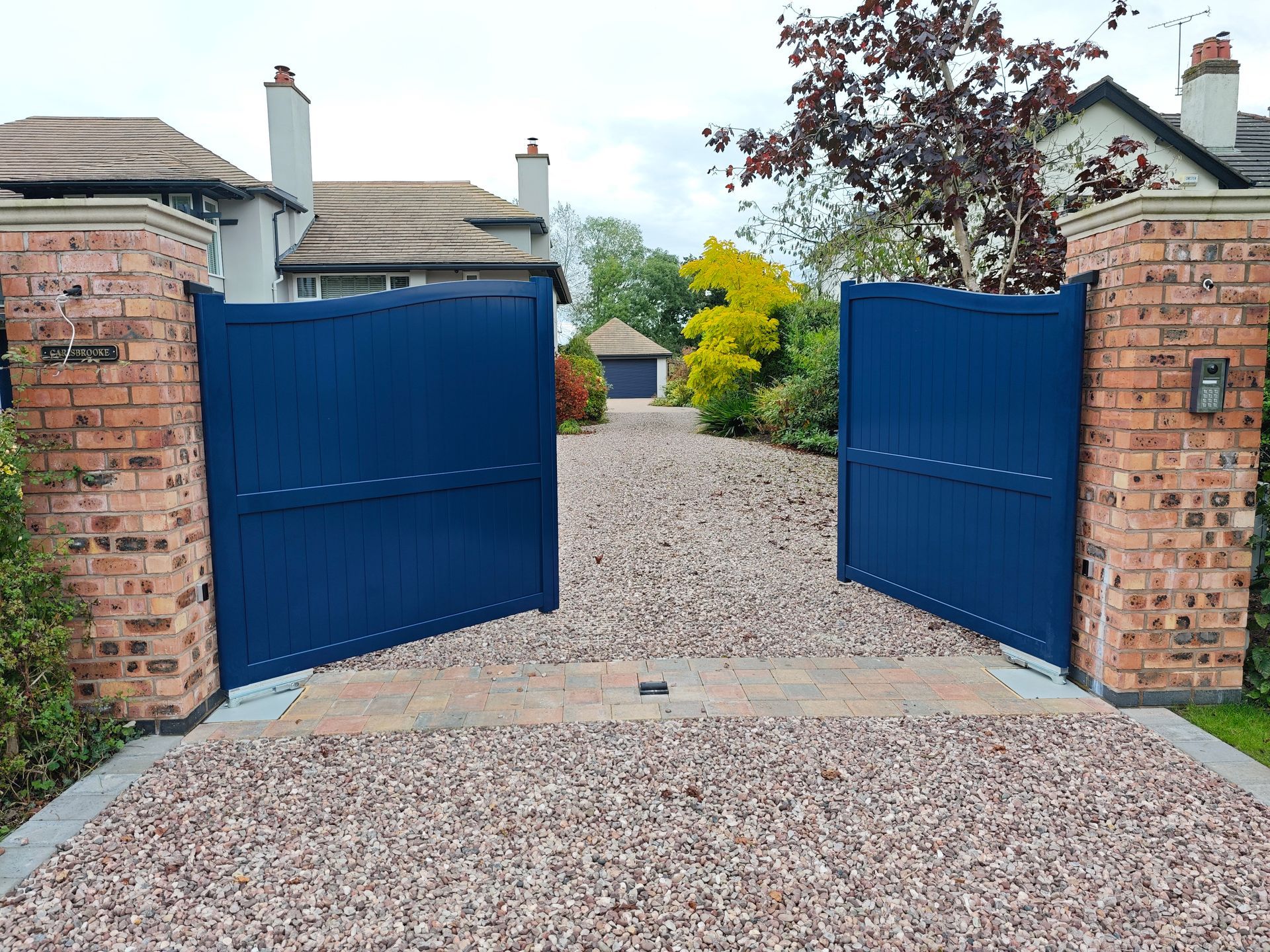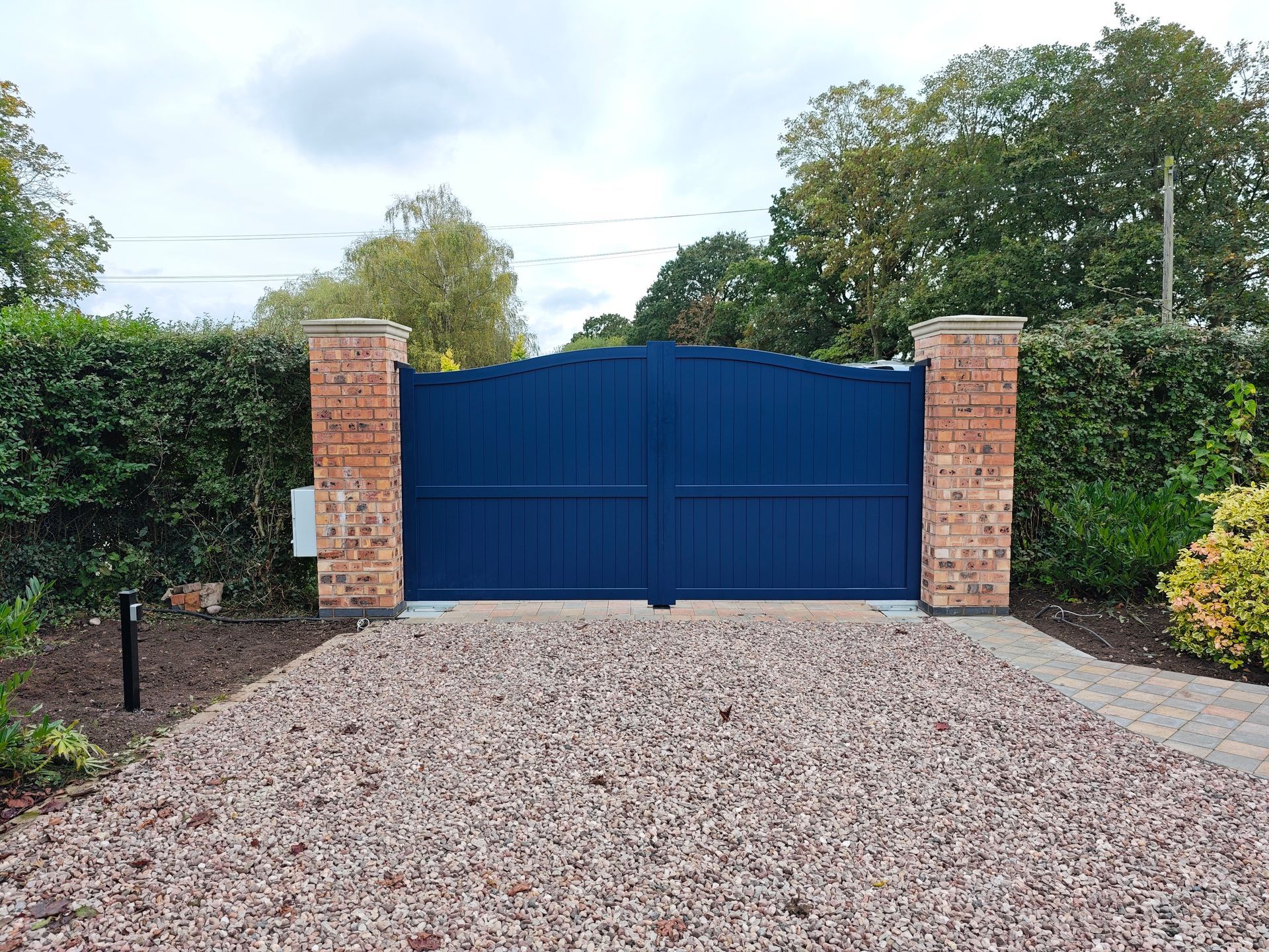 Aluminium gates in anthracite with matching 150mm square aluminium posts concreted into the ground. Nice L Fab underground automation with wiring installed across the driveway weeks before the tarmac arrived.