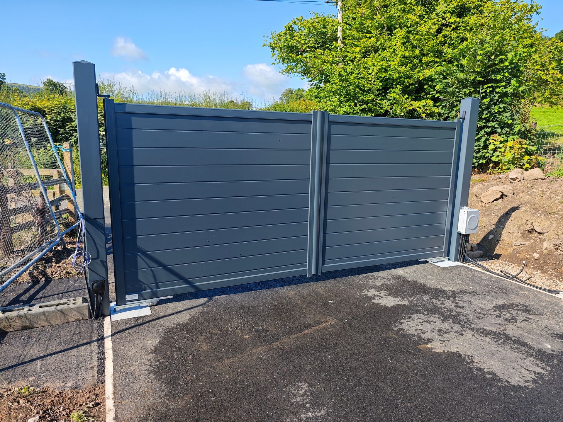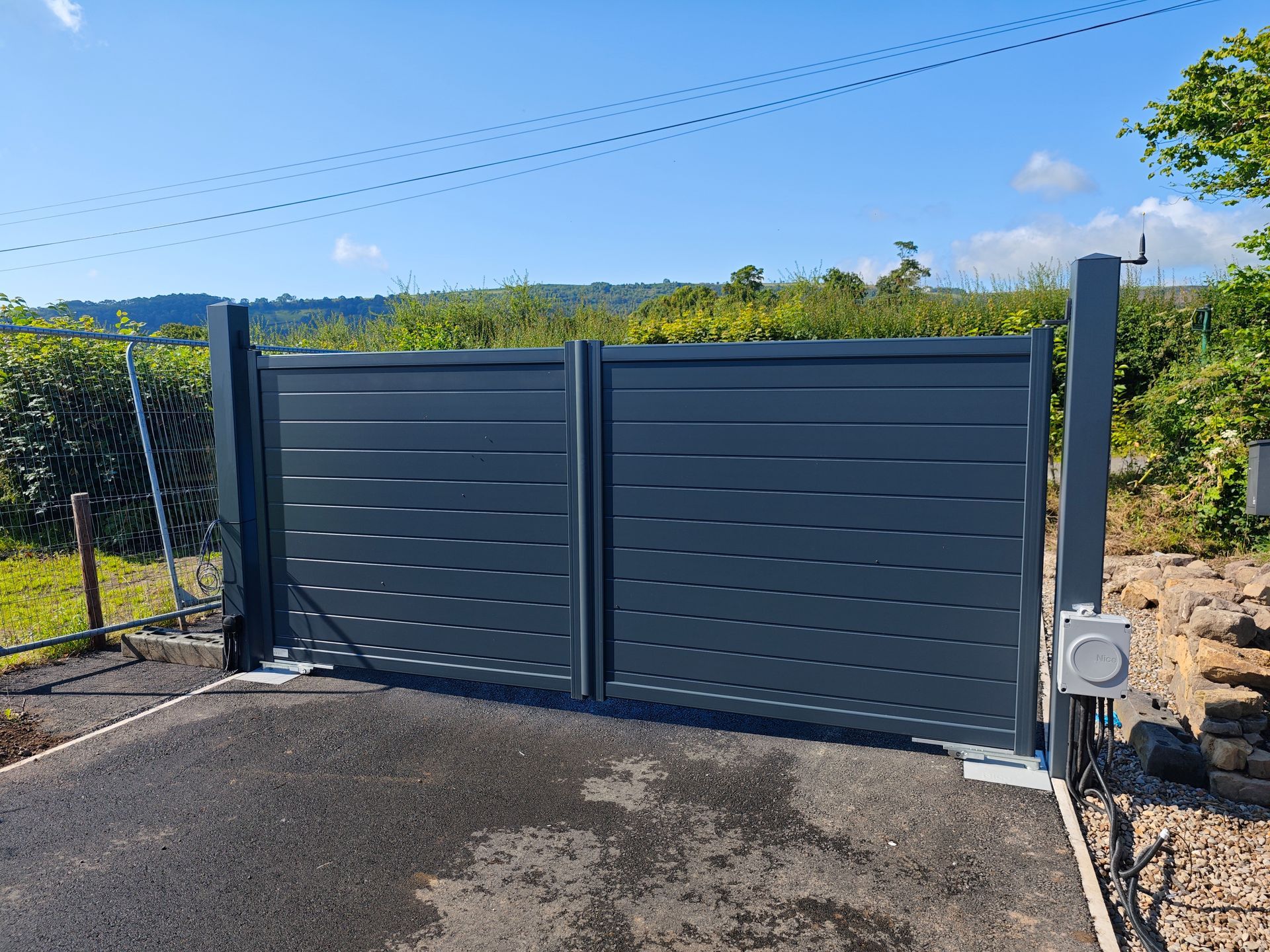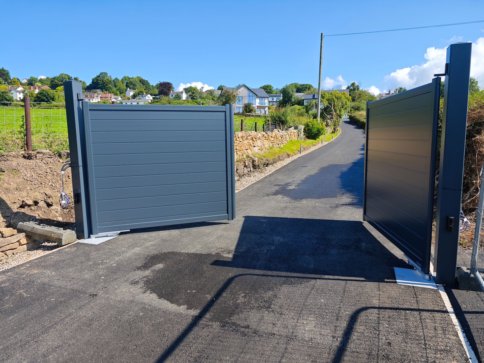 Aluminium gates in anthracite with matching 150mm square aluminium posts concreted into the ground. Nice L Fab underground automation with wiring installed across the driveway weeks before the tarmac arrived.
