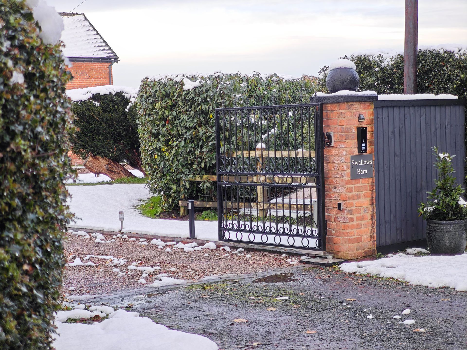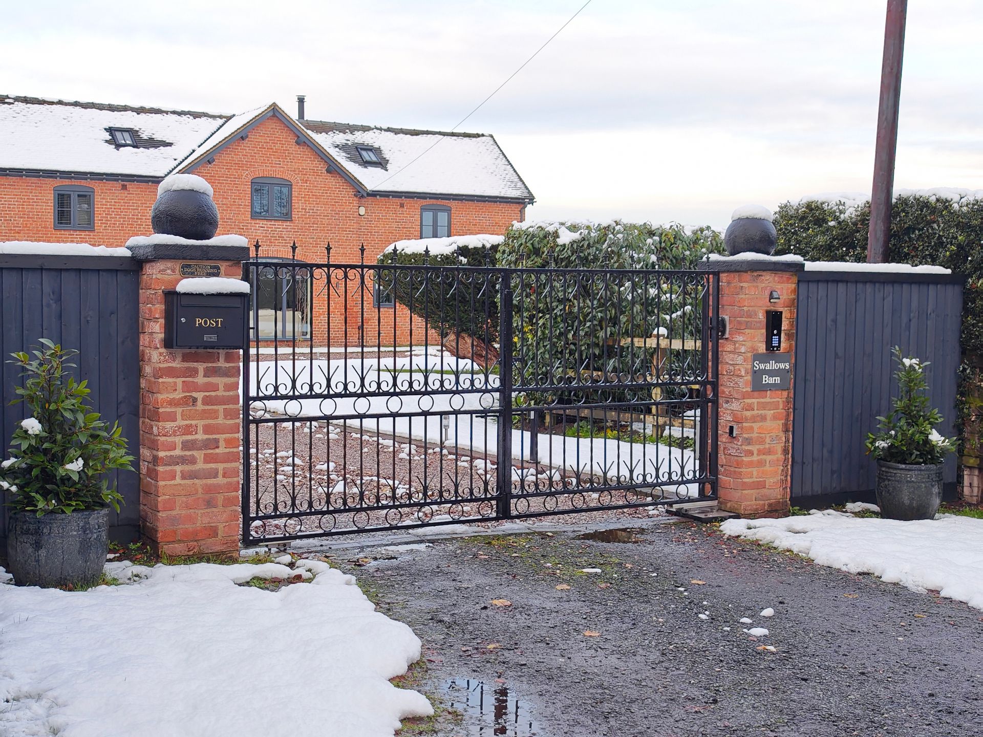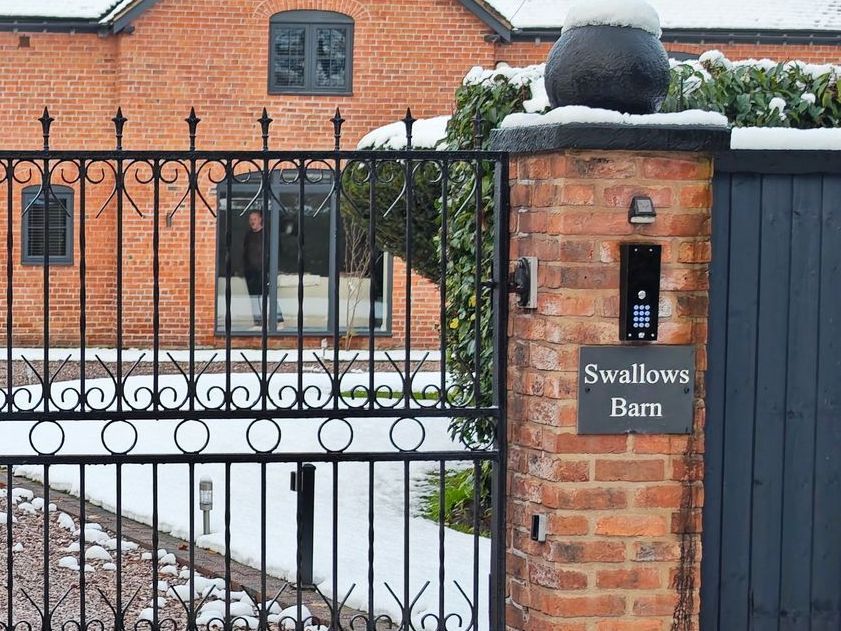 Existing manual gates were removed and shot blasted before being powdered coated black. Then mounted to new steel post's set behind the existing brick piers. Nice L fab underground automation was installed along with an AES exit loop and safety devices.